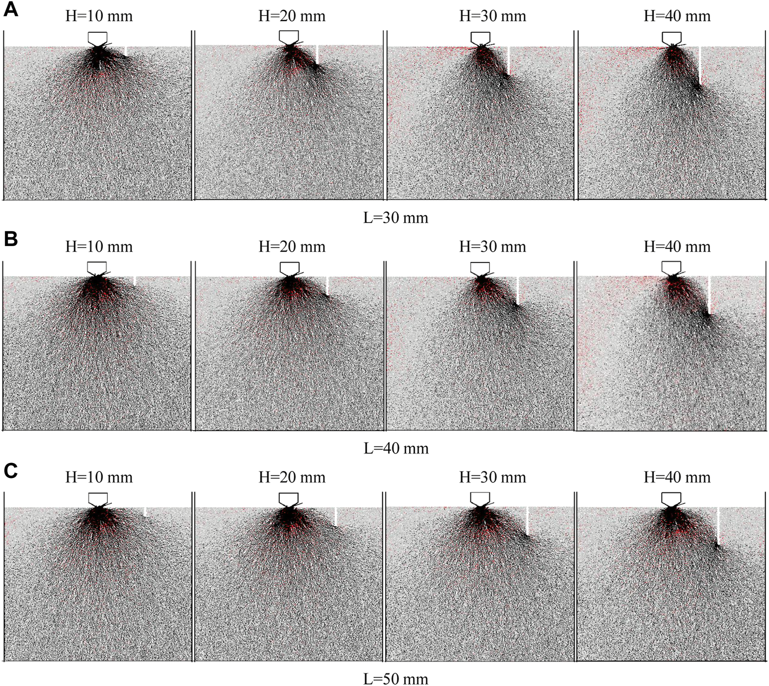 Distribution of force chain field with different precutting slit parameters. (A) L = 30 mm, (B) L = 40 mm, (C) L = 50 mm