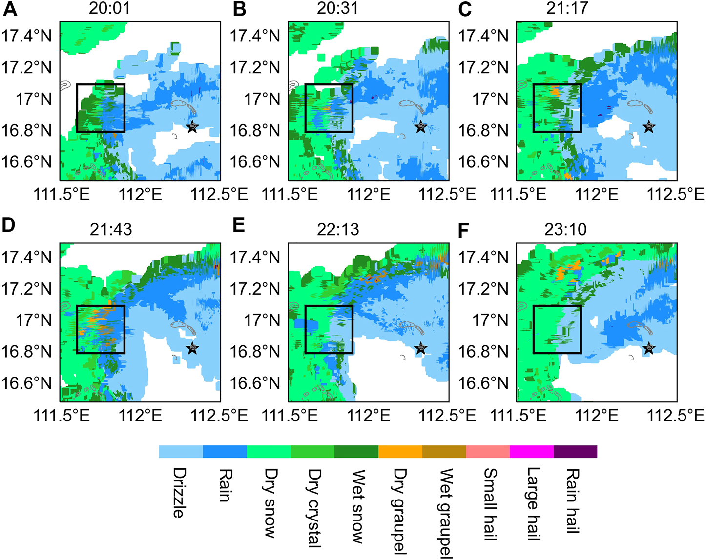 From the evening to the night of 16 October 2021, there were thunderstorms occurred in Xisha and surrounding regions. The precipitation on Yongxing Island was concentrated from 19:00 to 20:00 (UTC+8, the same below), with the hourly rainfall of 11.3 mm (Figure 1A). Due to the “Cone of Silence”, it is difficult to study the cloud directly above the radar, and to reduce the influence of radar scanning field on statistics, a fixed square region (Region 1, 111.6°E–111.9°E, 16.8°N–17.1°N, a size that can contain a complete convective cell) in the west was selected for further analysis, instead of tracking the clouds. Mean rainfall of Region 1 estimated by Eq. (2) is shown in Figure 1B, and radar reflectivity during the rainfall period are shown in Figure 2. The black square in Figure 2 denotes Region 1, and radar reflectivity depicts that the precipitation clouds were mixture of convective and stratiform clouds. Scattered convective bubbles with high reflectivity were embedded in broad stratiform clouds with low reflectivity. Under the prevailing east wind, the clouds system kept moving westward, and the Region 1 was successively affected by different clouds. At 20:01, the strong echo belt from northeast to southwest was located in the east of Region 1, then it moved westward and weakened at 20:31. At 21:17, the rear enhanced convective clouds moved to the eastern edge of Region 1, making the rainfall begin to increase. And at 21:43, Rigion 1 was almost covered by convective clouds, the strongest rainfall occurred, with the rate increasing from less than 4 mm h−1 to more than 14 mm h−1. Later, as the convective clouds moved out and decayed, the echo over Region 1 weakened and the mean rain rate dropped to less than 2 mm h−1, the rainfall tended to end.