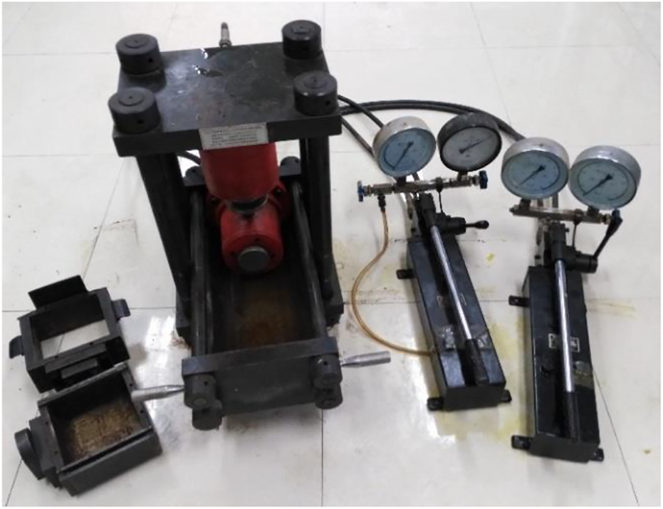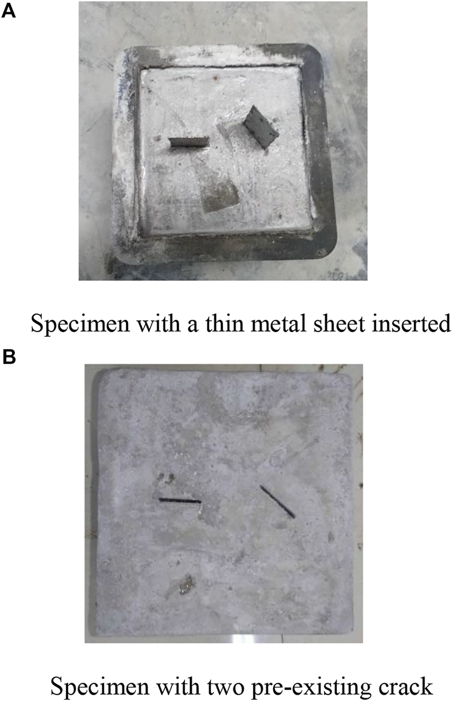 The two intermittent cracks are simulated by pre-cracks in specimens which are made of similar materials. By mixing cement, fine sand, and water in the ratio of 1:1:0.4 (Zhao, 2012), rock-like material specimens were made for laboratory test. Meanwhile, the closed pre-cracks of different attitudes can be made by the following two steps: 1) insert a thin metal sheet into the specimen during the initial setting period (as shown in Figure 2A); 2) Pull it out before the end of the initial setting. Then a rock-like specimen with two pre-cracks of different attitudes is accomplished (as shown in Figure 2B).