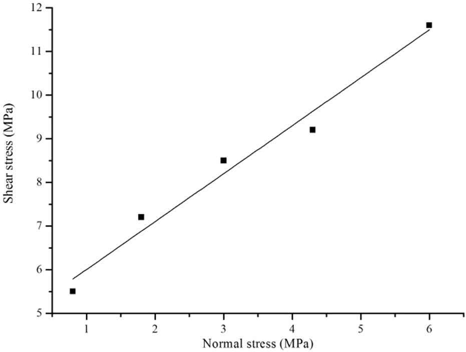 Direct shear tests are carried out on intact specimens under different normal stresses (as shown in Figure 3), and the shear strengths of each specimens are obtained and plotted in Figure 4. The linear equation in Figure 4 is obtained by fitting as follows:where σ is the normal stress, MPa; τ is the shear strength of specimens, MPa. The results show that the cohesion c is 4.70 MPa, and the internal friction angle φ is 43.2° for the intact specimen. The direct shear test equipment is shown in Figure 3, and shear stress and shear displacement are recorded and curves are drawn during the test.