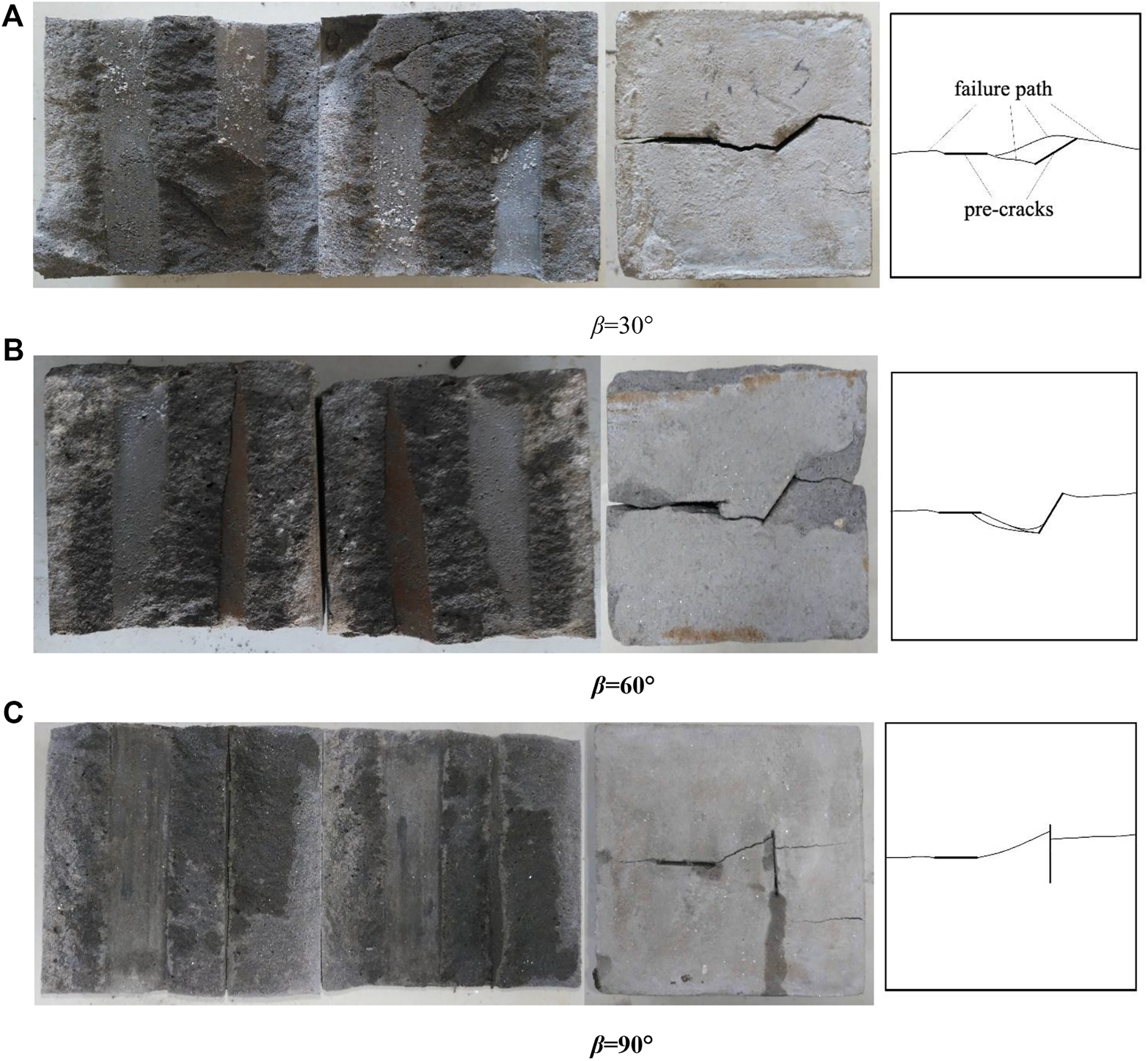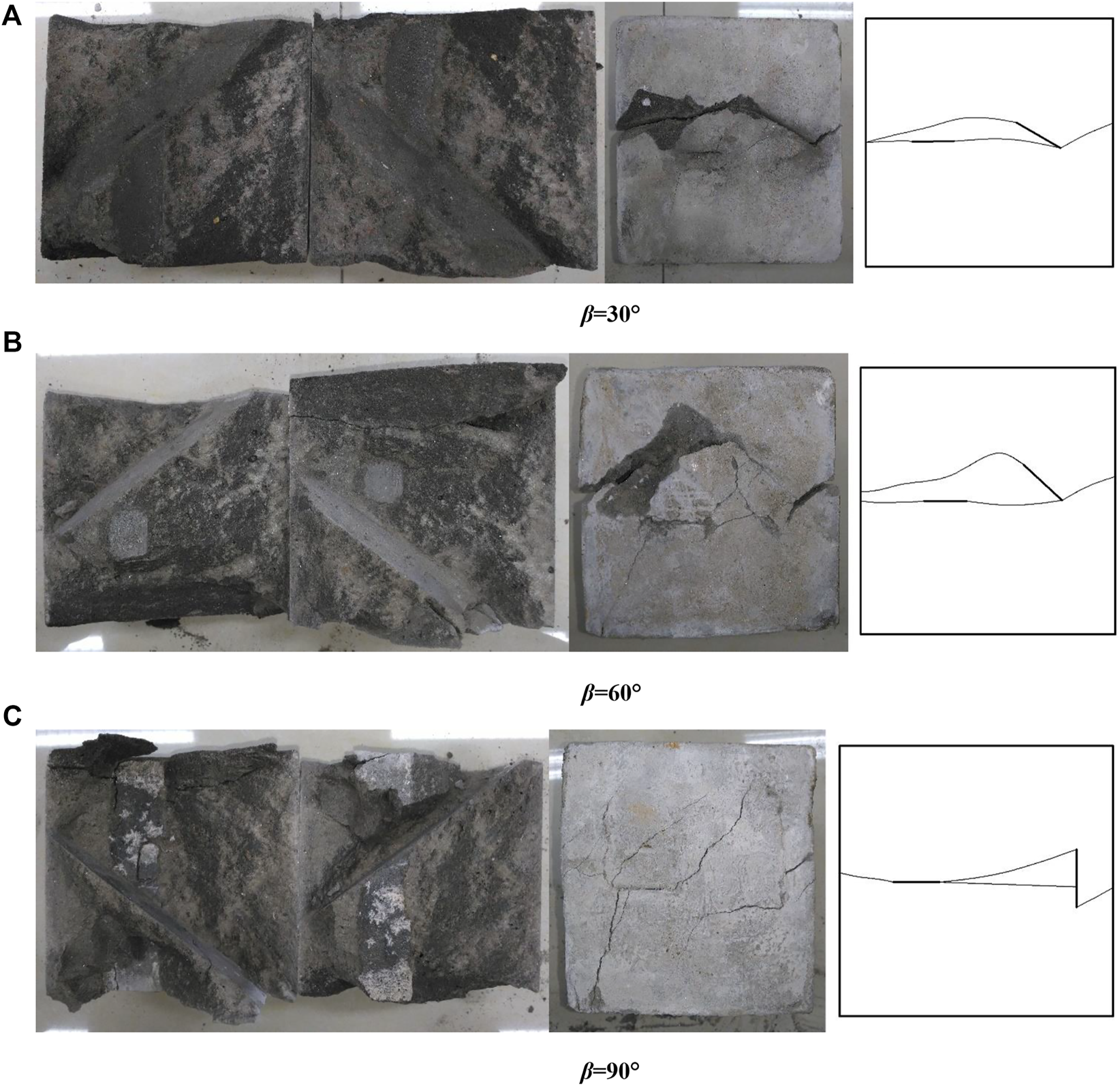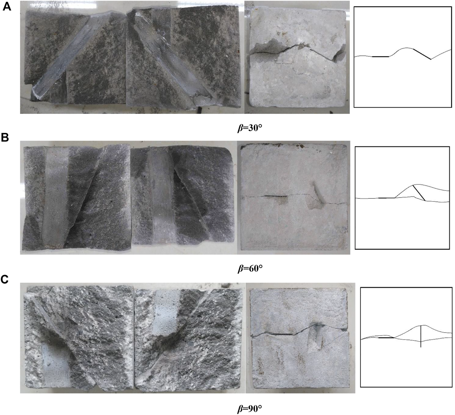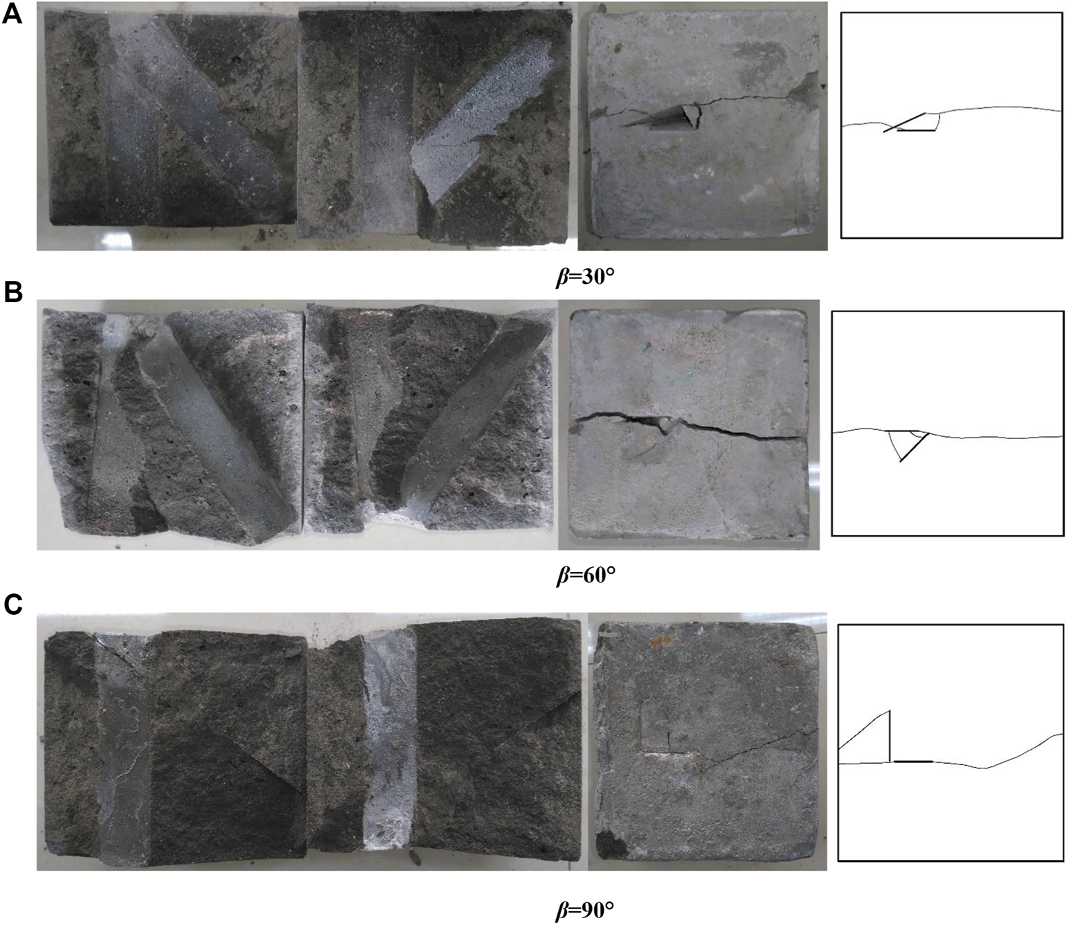Shear failure surface and form of specimens under normal stress of 1 MPa (α = 45°). (A)β = 30°, (B)β = 60°, (C)β = 90°.