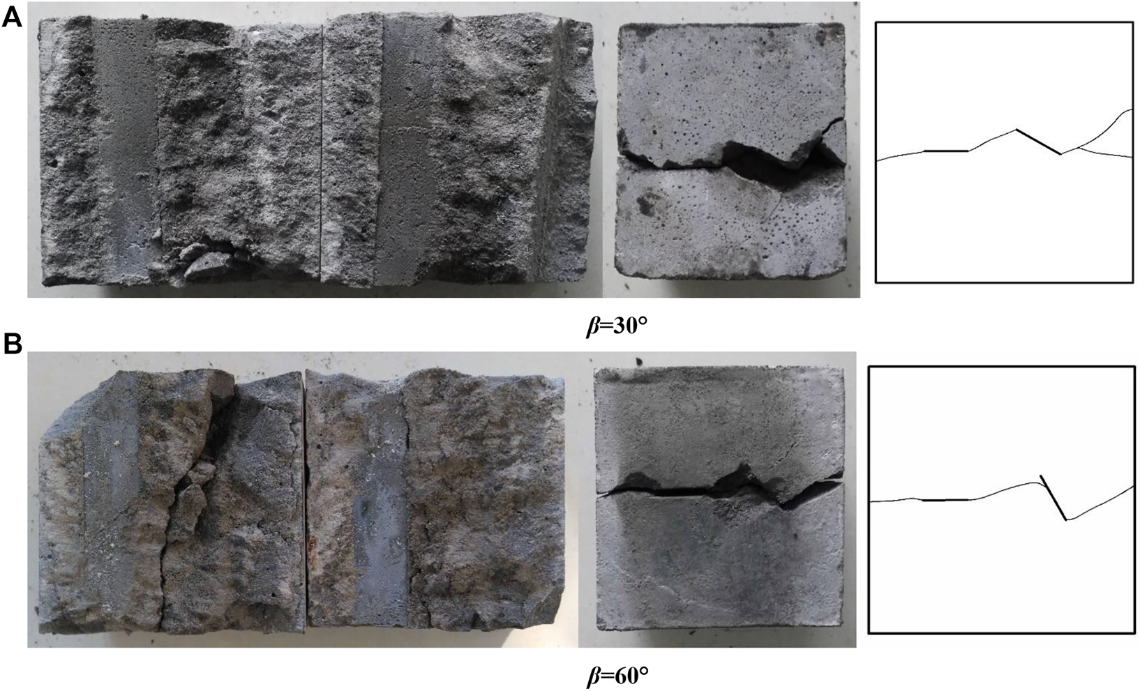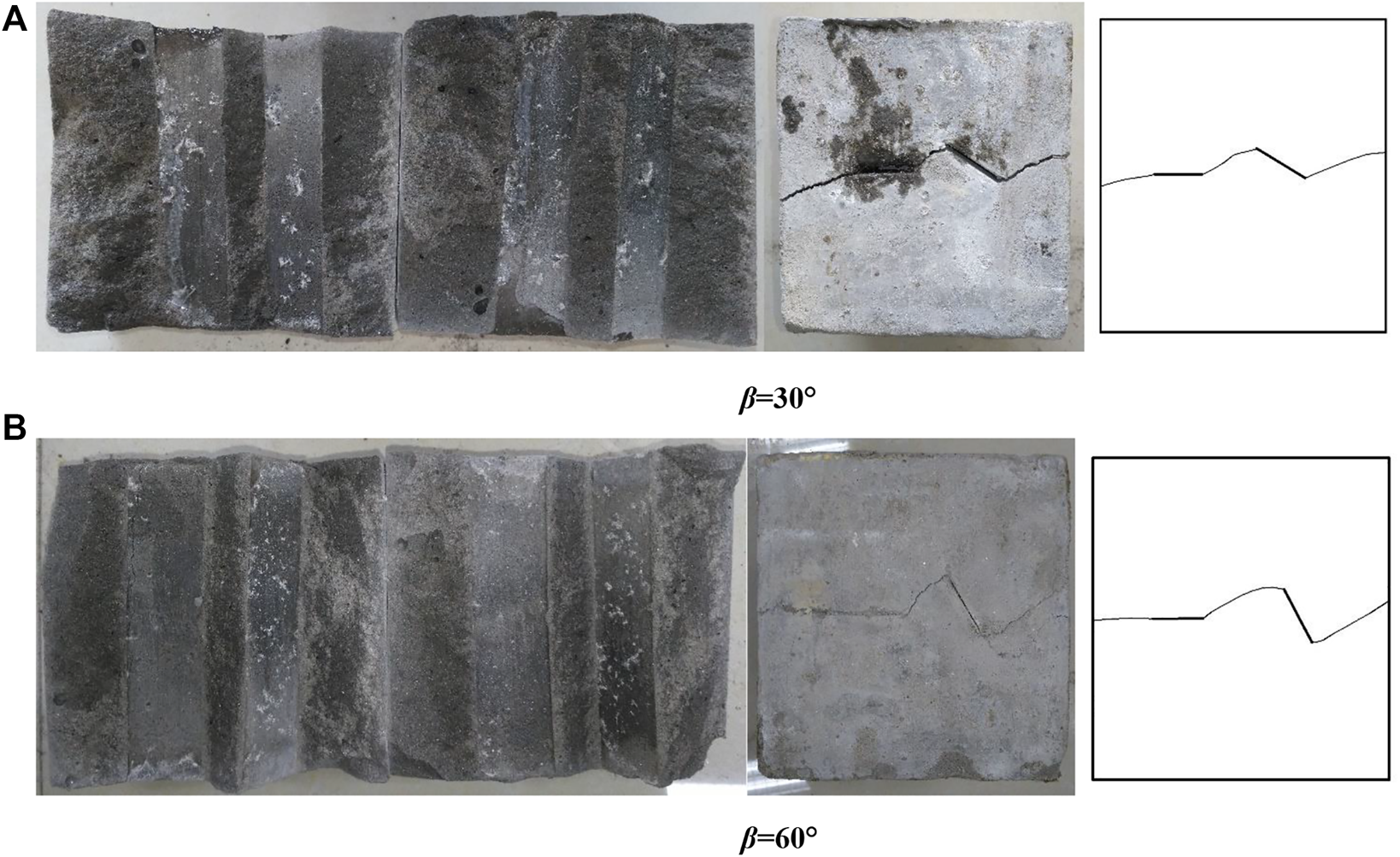 Shear failure surface and form of specimens under normal stress of 1 MPa (α = 180°). (A)β = 30°, (B)β = 60°.