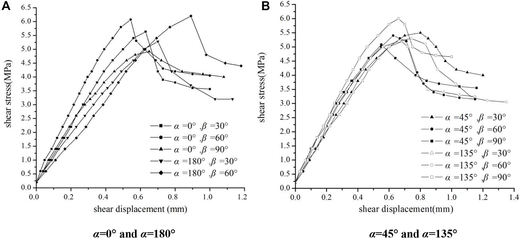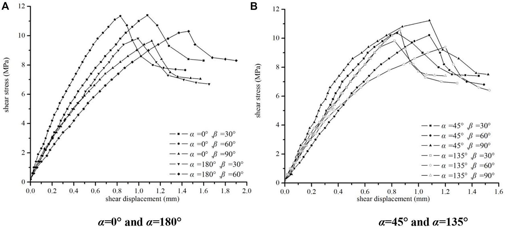 With the normal stress of 1 MPa, the shear stress-shear displacement curve obtained from the test is shown in Figure 9. It is indicated that the curve of each specimen can be divided into four stages: elastic stage, crack initiation stage, peak stage, and residual stage. In elastic stage, the shear stress increases linearly with the shear displacement; then the slope of the curve gradually decreases in crack initiation stage, indicating that microcracks are generated in the sample; in the peak stage, the shear stress reaches the maximum, then decreases gradually; finally, shear stress reduced to residual strength, and the specimen is cut through by the fracture surface. When α = 0° and α = 180°, the shear stress-shear displacement curves of the specimen are quietly different, which is mainly reflected in the differences in the appearance of peak strength, and the slope of the curve in elastic stage. During elastic stage, the slope of the shear stress-shear displacement curve is lower when α = 180°, the shear stress increases slightly, and the crack initiation occurs relatively late. On the contrary, the shear stress rises rapidly when α = 0°, and crack initiation occurs earlier. The crack initiation stage of α = 0°, β = 60° specimen is shorter, and the peak shear stress appears earlier. In addition, the crack initiation stage of α = 0°, β = 30° specimen is relatively longer. As shown in Figure 9A, the shear strength of specimens α = 180°, β = 60° and α = 0°, β = 60° is higher, while specimens α = 0°, β = 90° is lower.