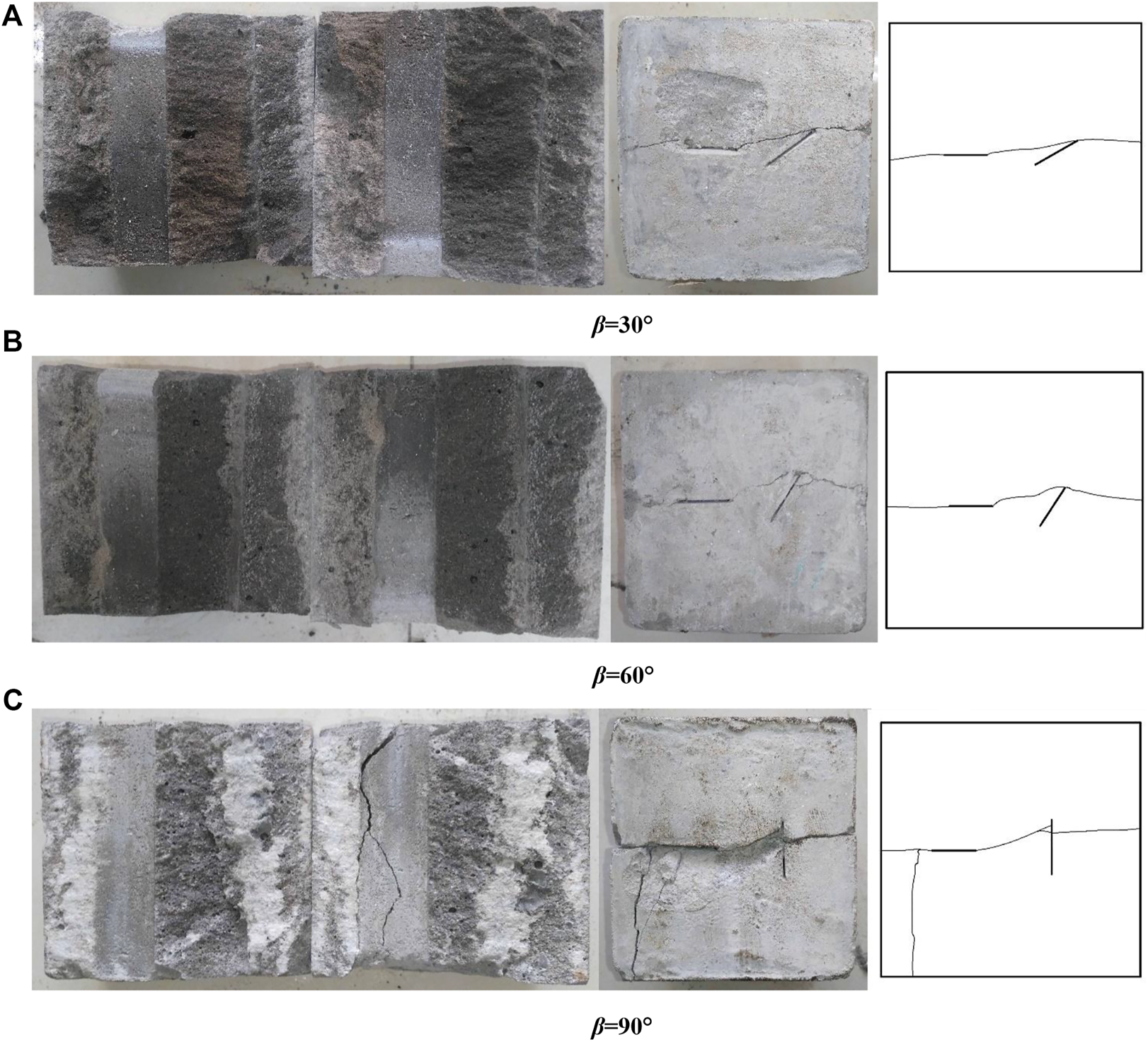 As shown in Figure 5, the failure forms of the horizontal crack of each sample are mostly the same, all specimens fractured along the horizontal cracks, and the fracture surface is relatively flat. On the other side, some different phenomena are obtained in the failure form of inclined pre-cracks. The failure modes, shear failure occurs along the two pre-cracks, are both observed in the specimens of α = 0°, β = 30°, and α = 0°, β = 60°. However, the fracture surface cut through the vertical crack in the specimen of α = 0°, β = 90°. The failure surface of the rock bridge is comparatively rough in these specimens, and no obvious scratches and debris are observed, which indicates that the fracture in the rock bridge is mainly tension failure.