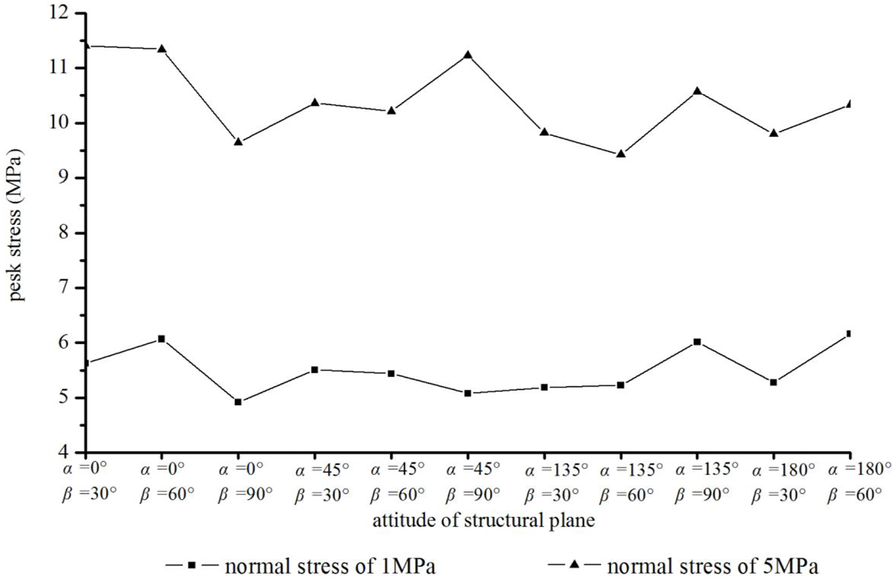 Figure 16 shows that the difference in peak stress of each sample is obvious. When the normal stress is 1 MPa, the strength of specimen α = 0°, β = 30°, and 60° is higher, while the strength of specimen α = 0° and β = 90° is lower, with a difference of about 1.2 MPa. When the normal stress rises to 5 MPa, the peak stress difference increases to 2.0 MPa due to the change in failure mode of some specimens, and the variation trend of peak stress curve is changed. In general, the shear strength of α = 45° and α = 135° specimens is slightly higher.