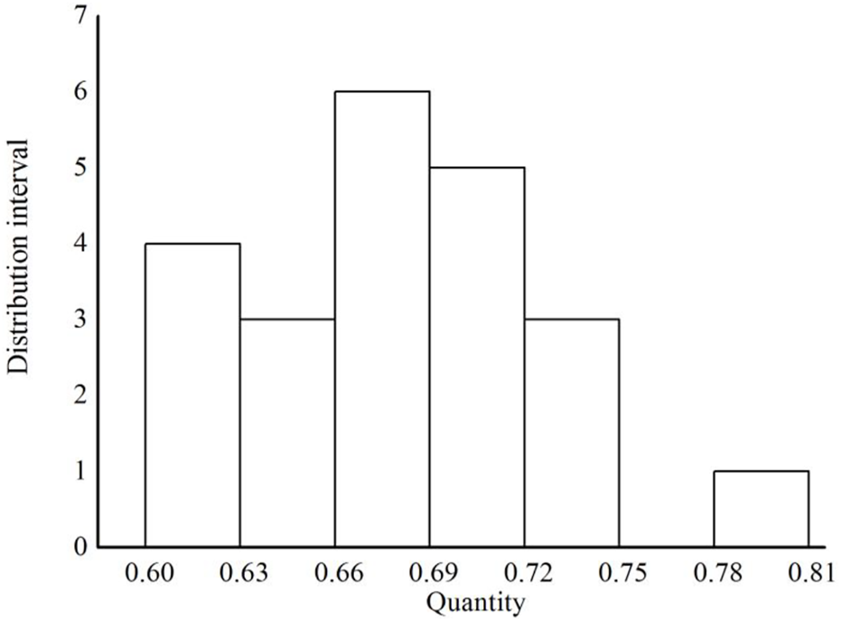It can be found from the table that the ratio of crack initiation and peak shear stress of each specimen ranges from 0.61 to 0.80, the minimum value is 0.614, which appears in the specimen α = 135°, β = 90°, and the maximum value is 0.793, which appears in the specimen α = 0°, β = 90°. Drawing the above ratios into a columnar statistical chart (as shown in Figure 17), it can be found that the ratio of the initial crack stress to the peak stress is mainly concentrated between 0.60 and 0.75, which has a certain statistical law. According to the crack initiation stress of the rock-like material, the peak shear strength of can be estimated (Bobet and Einstein, 1998, Lajtai, 1969, Yin et al., 2014, Zhou et al., 2013).
