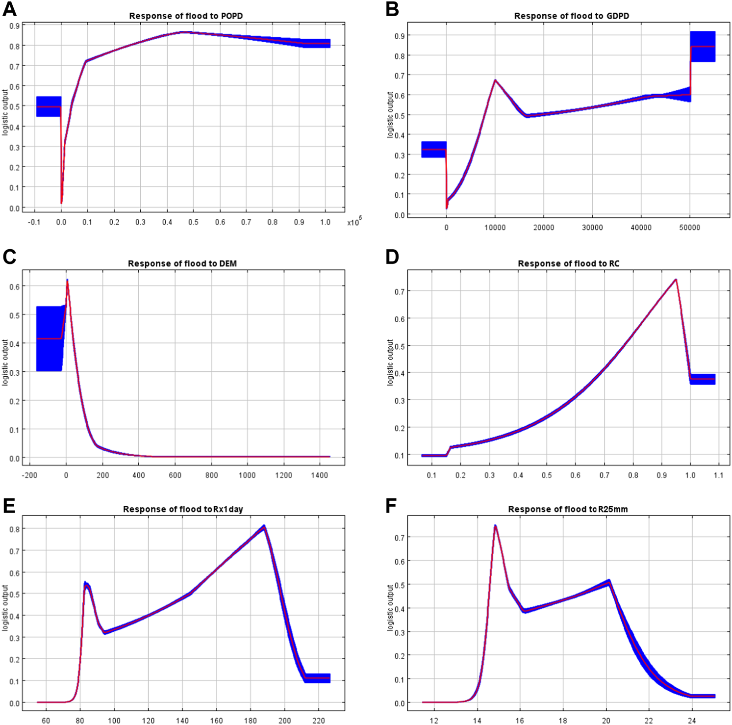 Previous studies have focused on the fact that extreme precipitation events were more pronounced under high emission conditions, leading to increased flood risk (Ji and Kang, 2015; Robbins, 2016). In this study, in terms of the impact on flood risk, it was the socio-economic and topographic indices, which contribute more to the risk of flooding, rather than the extreme precipitation indices. In contrast, the lower explanatory power of Rx1day and R25 mm as disaster-inducing factors was caused by the higher precipitation intensity in the PRD region (Kong et al., 2017). The spatial distribution of flood risk due to abundant precipitation was more dependent on the disaster-breeding environment and the disaster-bearing bodies. As urbanization accelerates, some natural green land converted to construction land, leading to an increase in impervious surfaces and resulting in an increased risk of flooding. In the analysis of the environmental indicator response curves, flood risk increased with increasing POPD, GDPD and RC and increased with decreasing DEM. The effect of Rx1day on the probability of flooding in this study was concentrated in the 140–200 mm interval. Theoretically, the above results are consistent with the basic laws of probability theory, as the MaxEnt model is an arithmetic model based on the Bayes Formula (Shipley, 2009; He, 2010). In the model, high rainfall is an extreme event with low probability of occurrence at the extremes (Robbins, 2016). Therefore, in this era of rapid social and economic development, people should pay more attention to the prevention of natural disasters such as flooding.