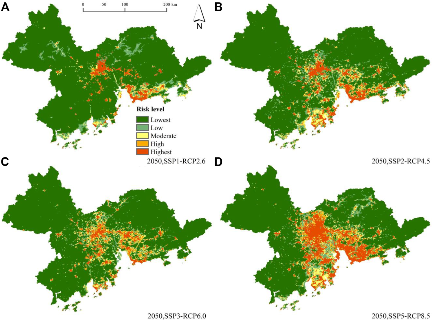 This study input the flooding blackspots data, the environmental indices data from the original scenario and the environmental indices data from the future scenario into the MaxEnt model. Then obtained the spatial distribution of flood risk in the PRD under scenarios SSP1-RCP2.6, SSP2-RCP4.5, SSP3-RCP6.0 and SSP5-RCP8.5 for 2030 and 2050. The flood risk divided into 5 levels (namely, lowest, low, moderate, high and highest), which has the same number of categories as the original scenario.