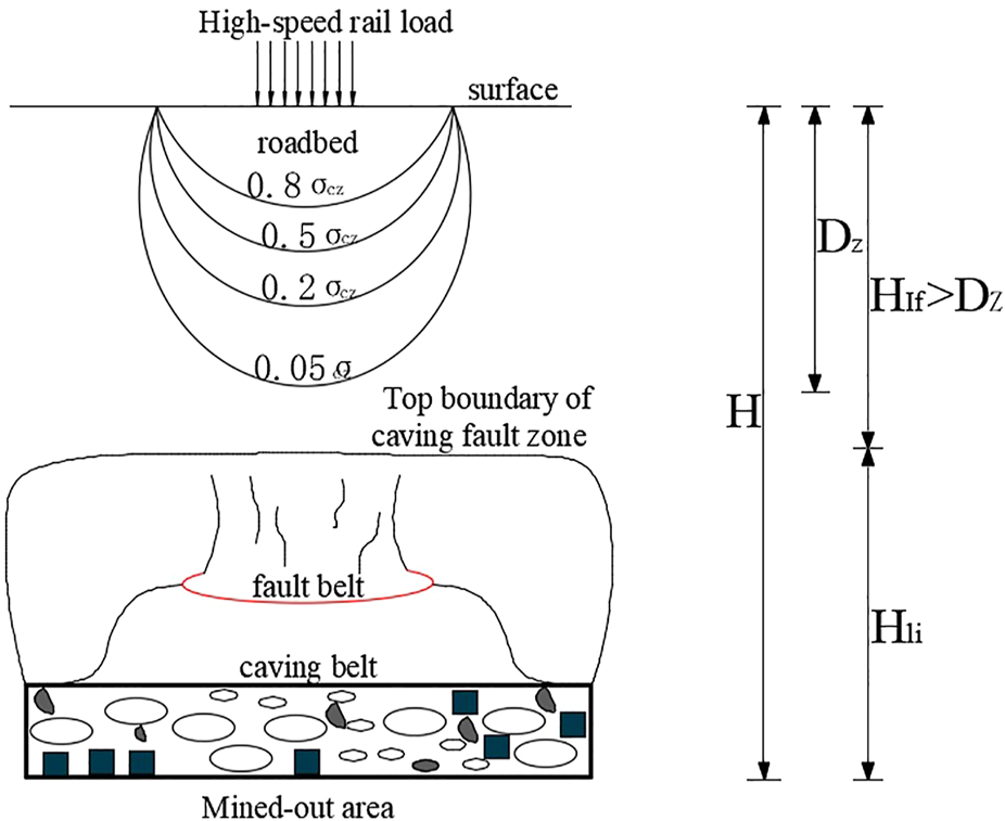 For the high-speed railway with the underlying mined-out area, the new embankment and vehicles in operation will form loads, which will be continuously transmitted downward in a certain form. When reaching a certain depth, the rock mass in equilibrium at the lower part will be disturbed and destabilized, resulting in the decline of embankment stability and re-deformation, which will make it impossible for vehicles to be driven normally and safely. In this paper, the new embankment materials above the goaf foundation are taken as the static load and the train in operation as the dynamic load, and the influence depth of the newly added loads on the goaf foundation is analyzed.