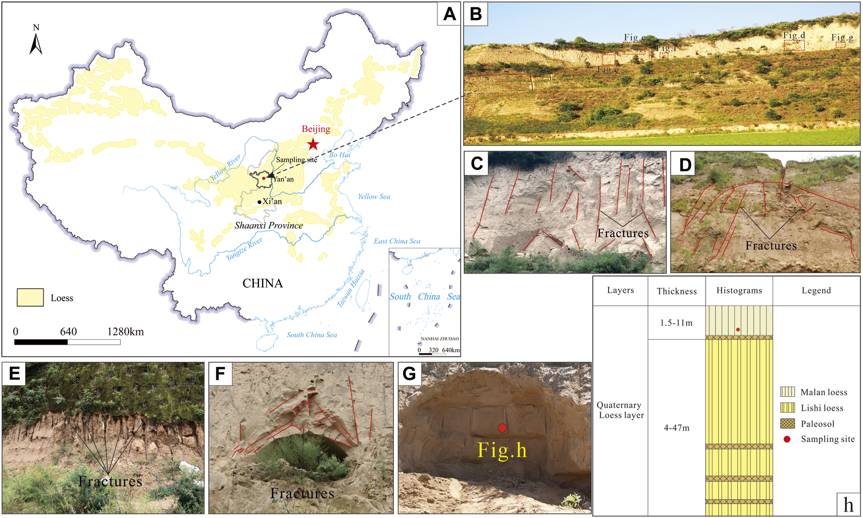 The Ansai District in Yan’an city, Shaanxi Province, China, is a typical loess gully landform with interlacing gullies, a long and narrow watercourse, and uneven terrain. Ninety-five percent of the area is mountainous, and only 24% of the area is arable. To solve the problems of serious soil wastage and the low economic value of development in this area, the Gully Stabilization and Land Reclamation project was carried out in Nangou in the Ansai District, with geographic coordinates of 36°34′39″N, 109°18′38″E (Figure 1A). The slope on both sides of the gully was excavated, and the excavated soil was filled in the gully to form a warping dam for later agricultural cultivation. However, a large number of issues, such as sheet erosion, rill erosion, local slip and slope foot collapse, occurred in the course of the Gully Stabilization and Land Reclamation project (Jiang, 2019). These issues are closely related to the rapid development of fractures (Skempton et al., 1969; Potts et al., 1990; George, 2014).