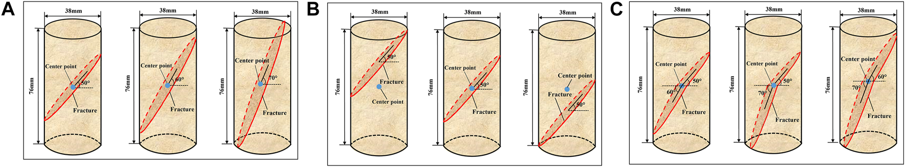 Fracture distribution patterns: (A) Different fractured angle; (B) Different fractured position; (C) Different composite fracture.