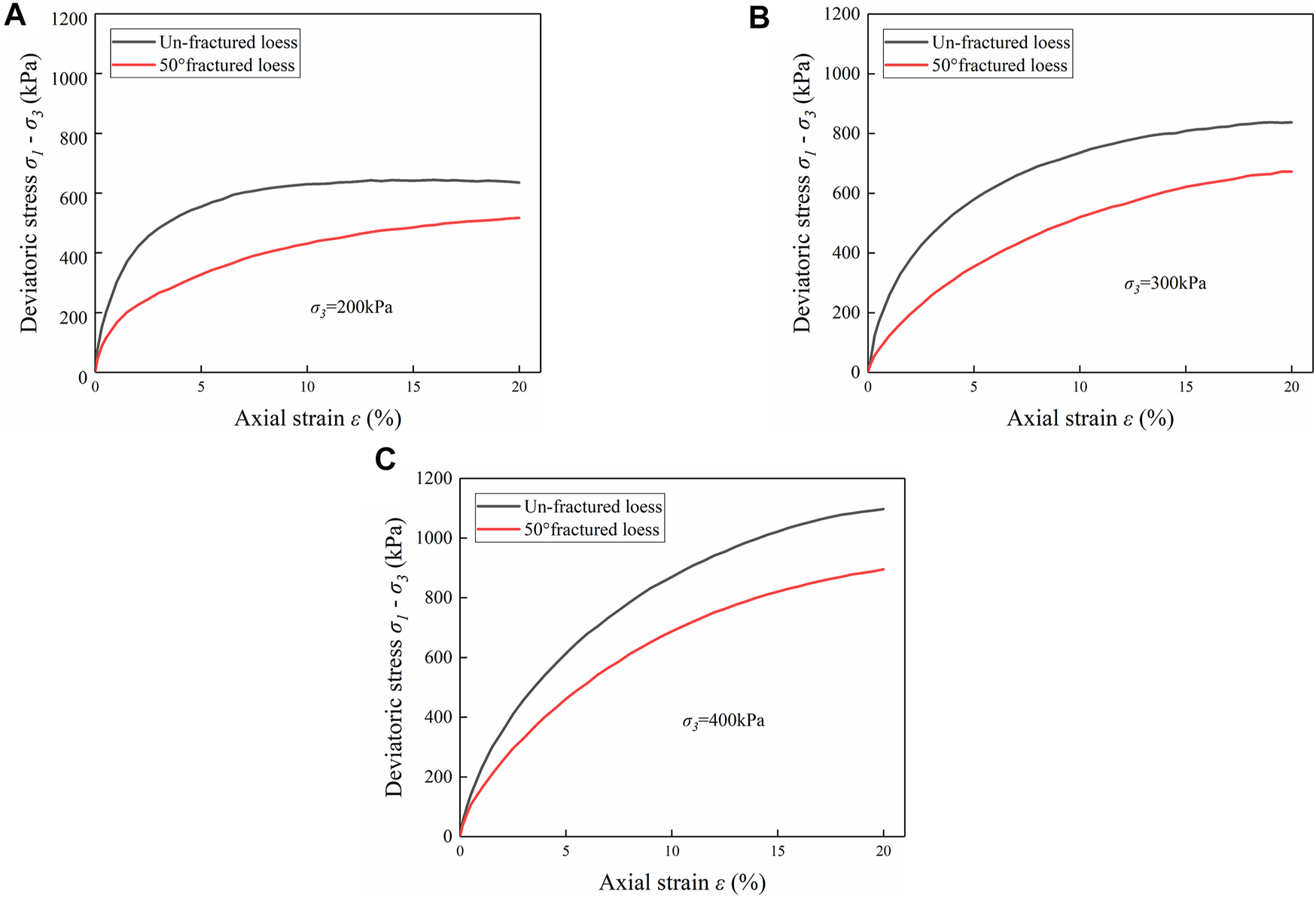 Deviator stress versus axial strain of without fractured loess and 50° fractured loess: (A)σ3=200 kPa; (B)σ3=300 kPa; (C)σ3=400 kPa σ3 confining pressure.