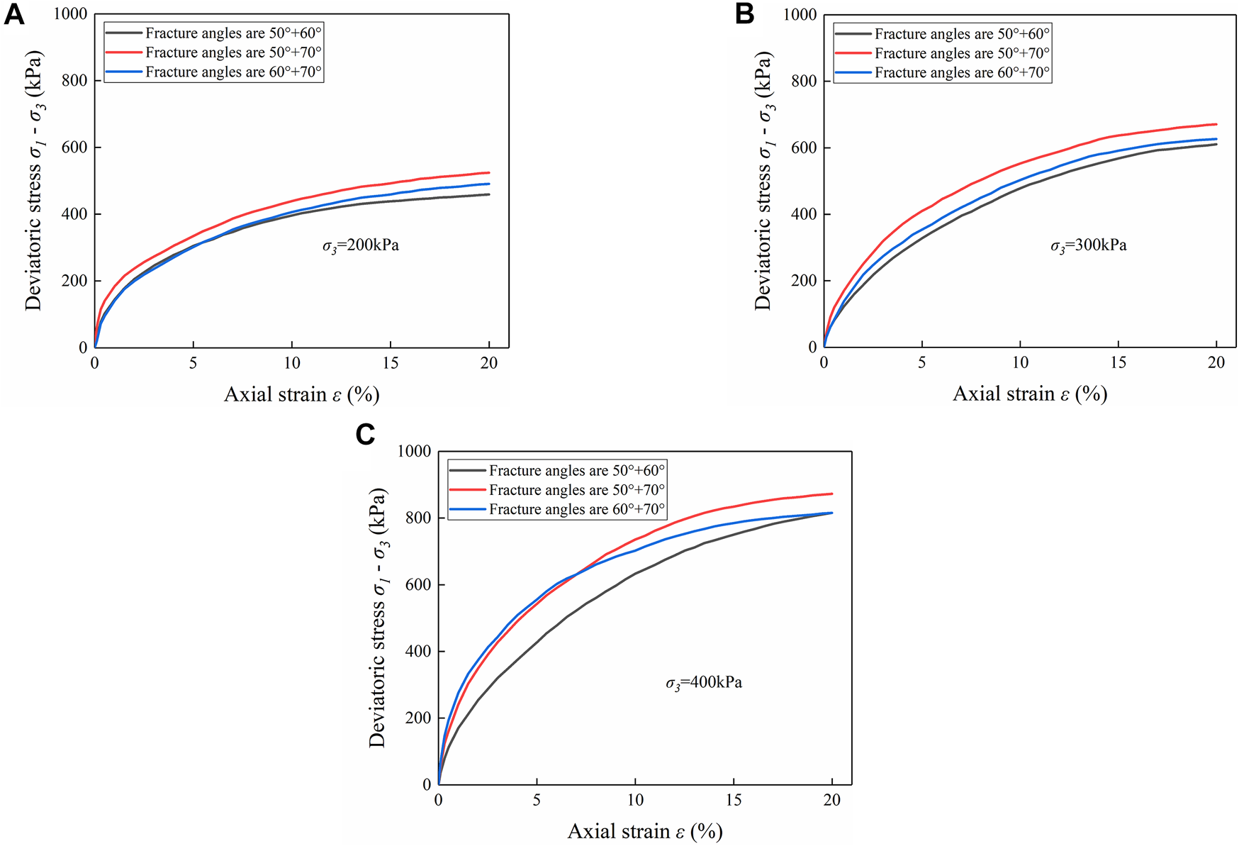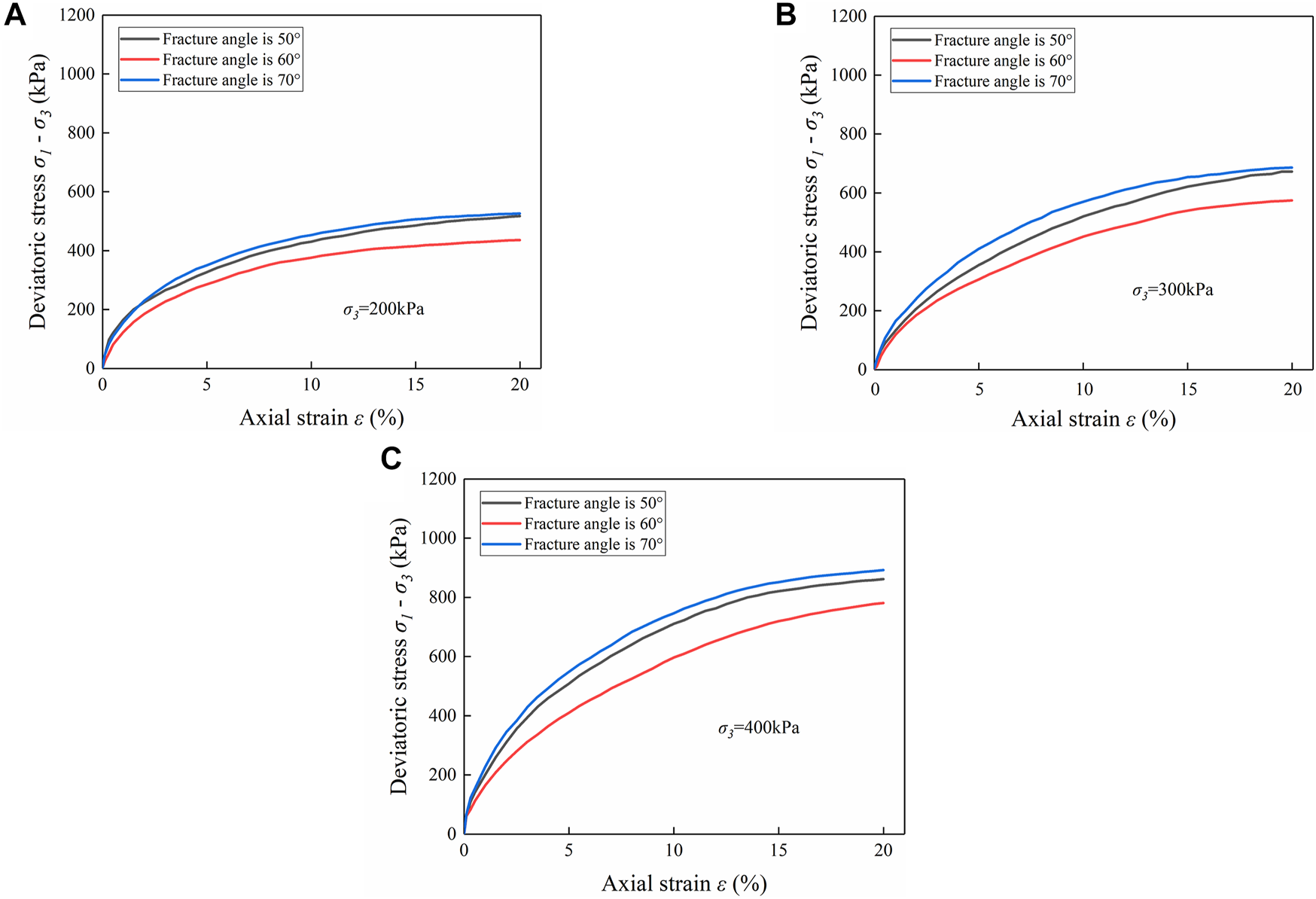 Figure 4 show that the stress-strain curves at different fracture angles are strain-hardening types. However, the inflection point and hardening degree of stress-strain curves at different angles are different. Under the same confining pressure, the hardening degree is at a minimum when the fracture angle is 60°, and the strain required to achieve the same deviator stress is larger. For example, when the confining pressure is 200 kPa and the deviator stress reaches 400 kPa, the strain required with a fracture angle of 60° is about 4.5%, while the strains required with fracture angles of 50° and 70° are only 3.1% and 2.8%, respectively. In addition, with the increase of confining pressure, the later the inflection point of stress-strain curve, the stronger the hardening degree of the curve.