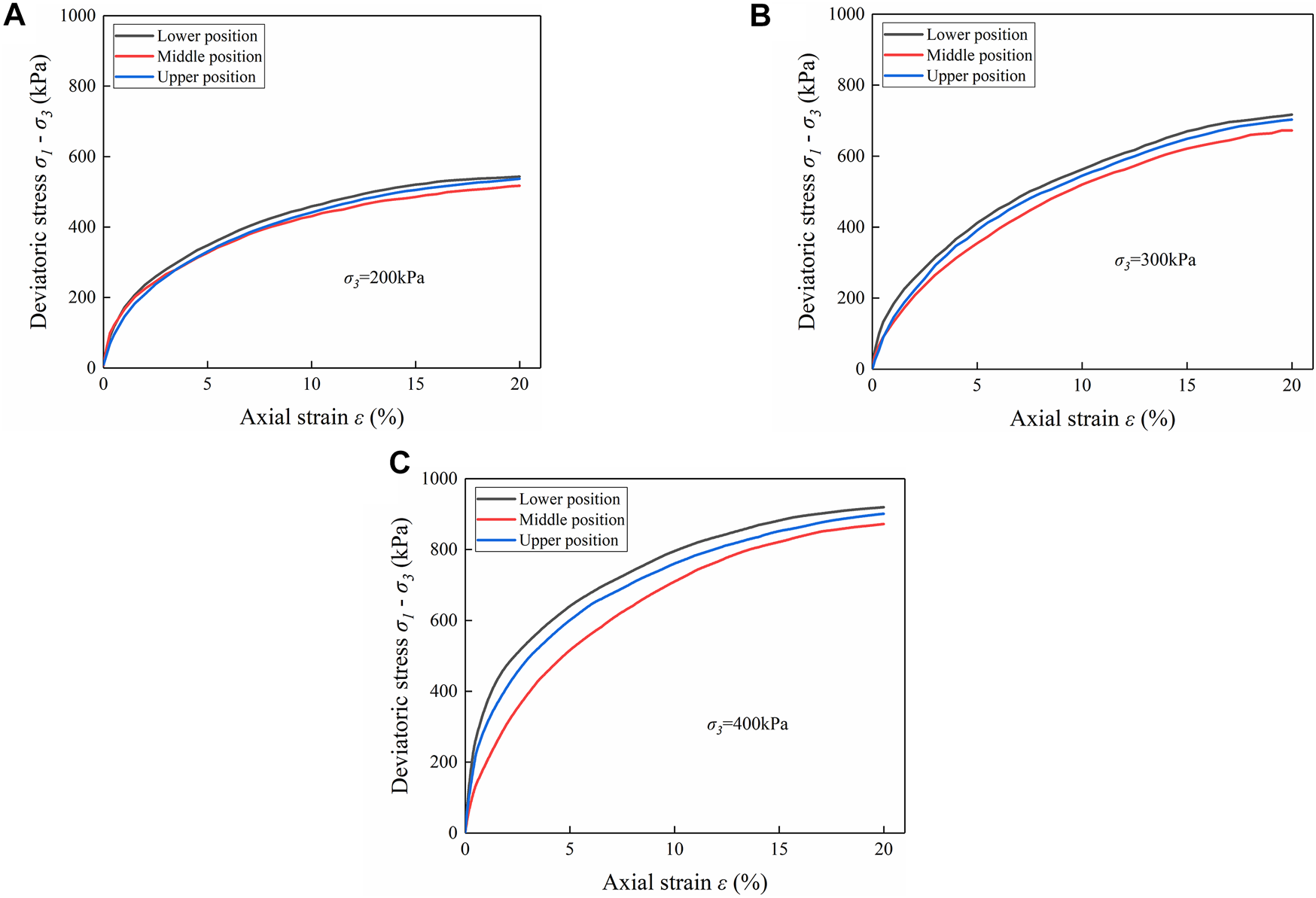 To explore the effect of the fracture position on the strength of loess, experimental results of fractured loess with upper, middle and lower fracture positions under confining pressures of 200 kPa, 300 kPa, and 400 kPa are taken as examples, as shown in Figure 5.