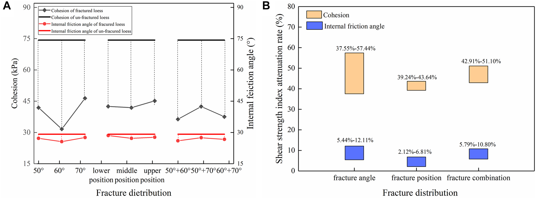 Curve of cohesion and internal friction angle of fracture loess with different fracture distribution pattern. (A) shear strength index; (B) shear strength index attenuation rate.