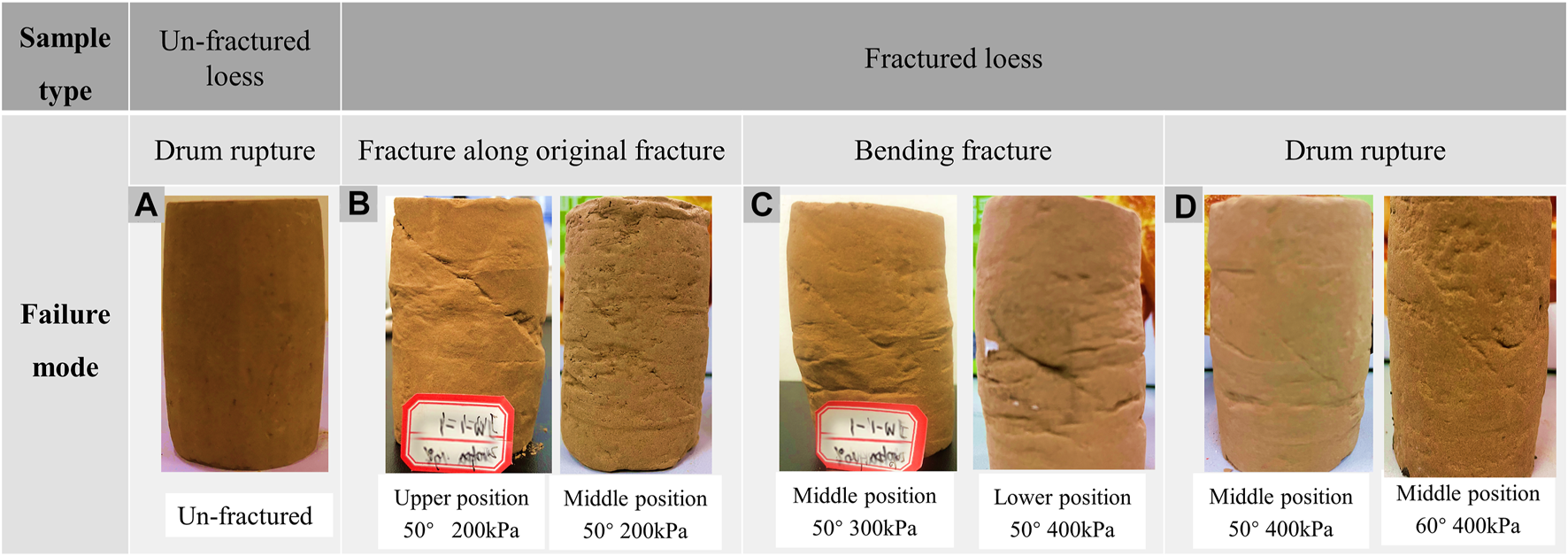 The difference of soil strength development in different fracture distribution patterns lead to the different failure modes (Lu et al., 2006a). For un-fractured loess, the sample occurs drum rupture (Figure 9A). For fracture loess, there are three the failure modes of sample: (1) fracture along original fracture. This failure mode mainly occurs at low confining pressure, and the failure occurs along the original fracture and even slippage (Figure 9B). (2) bending fracture. When the confining pressure is high, the soil is prone to bending failure. In particular, when the fracture is farther away from the sample center, the bending failure is more obvious (Figure 9C). (3) drum rupture. The original fracture of the sample is more closed and is not destroyed along the fracture, which mainly occurs when the fracture is located in the center of the sample and the confining pressure is high (Figure 9D).