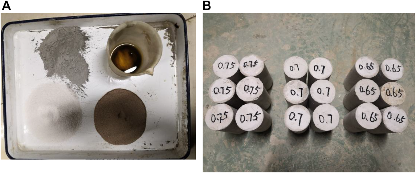 Materials used for orthogonal tests: (A) Surrounding rock material preparation and (B) Gypsum specimens.