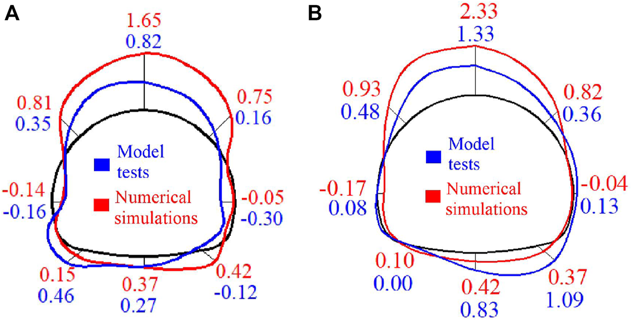 Third principal stress of lining structure in numerical simulations and model tests (unit: MPa): (A) Stress outside the lining structure and (B) Stress inside the lining structure.