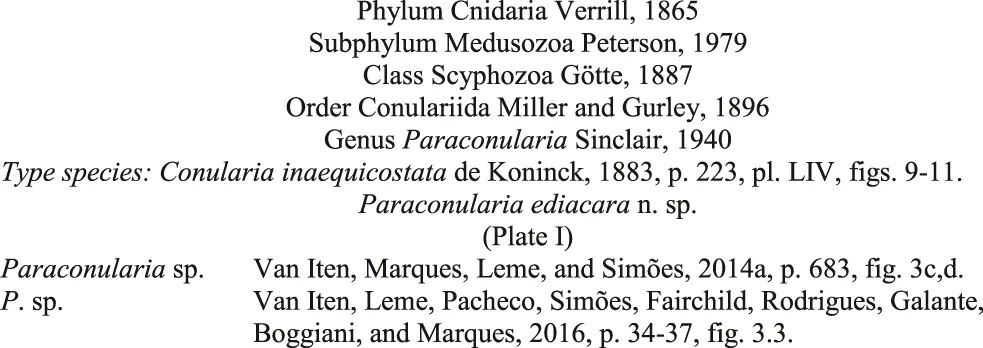 Described in this article is the first documented Neoproterozoic conulariid, Paraconularia ediacara n. sp. from the terminal Ediacaran Tamengo Formation (upper Corumbá Group) of west-central Brazil. This conulariid, currently represented by a flattened partial periderm preserving such anatomical features as transverse ribs, nodes, and microlamellae, was originally identified (Van Iten et al., 2014a; Van Iten et al., 2016) as Paraconularia sp. Previously, the oldest known occurrences of Paraconularia were in strata of Middle Devonian age (Hergarten, 1985; Babcock and Feldmann, 1986), and therefore the presence of this genus in the topmost part of the Ediacaran System is truly noteworthy.