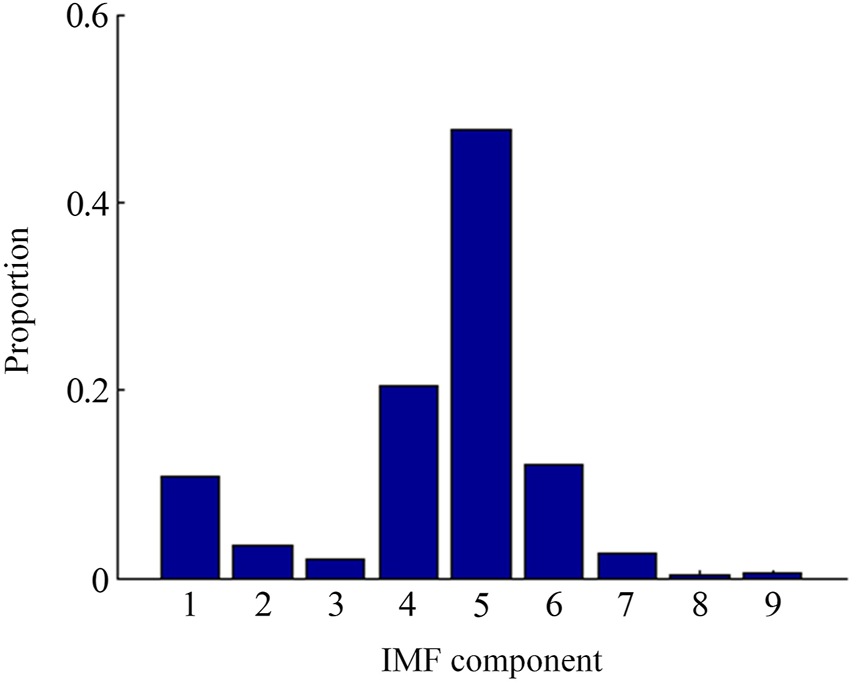 The EMD analysis method is used to empirically decompose the original signal to obtain a series of IMF components, as shown in Figure 8. The correlation coefficient of each IMF component and the original signal and the energy ratio of each IMF component are calculated. The calculation results are shown in Figures 9, 10.