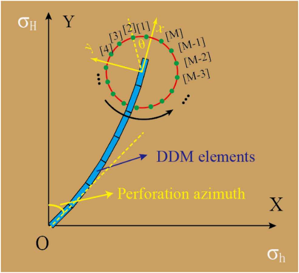 Two mechanical conditions need to be met for the HF to continue to propagate through the NF (Gu and Weng, 2010). One is that the maximum principal stress at the tip of the HF reaches the tensile strength of rock mass in the forward direction of the HF. The other is that there is no shear slip at the NF interface.where σ1 is the maximum principal stress, Pa; T0 is the tensile strength of rock, Pa; τβ is the shear stress on the wall of the NF, Pa; S0 is the rock cohesion, Pa; μf is the friction coefficient; and σnβ is the normal stress on the wall of the NF, Pa.