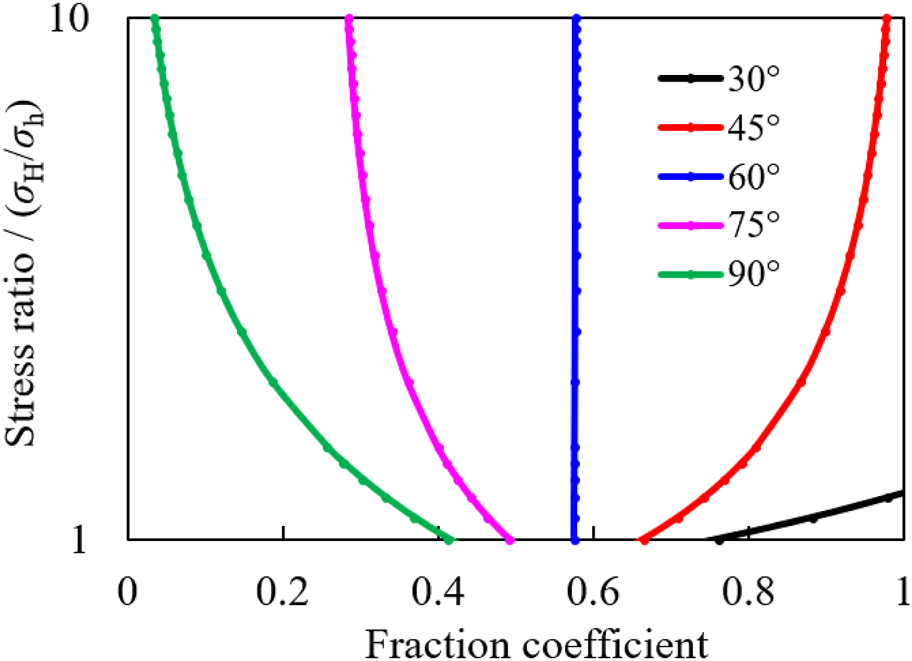 Figure 4 is the interactive propagation chart of the HF and NF under different friction coefficients and stress conditions. When the approach angle β between the HF and NF is greater than 60°, with the increase in stress ratio, HFs are easier to penetrate the NF. Also, when the approach angle β is less than 60°, with the increase in stress ratio, HFs are easier to be captured by the NF. Under the same principal stress ratio, the greater the friction coefficient, the easier it is for the HF to penetrate the NF because under the condition of high friction coefficient, the greater the friction on the NF surface, the less likely it is to shear slip, which is conducive to the HF to directly pass through the NF surface. When the HF is 90° orthogonal to the NF, the friction coefficient is greater than 0.41, and the HF will hardly propagate along with the NF.