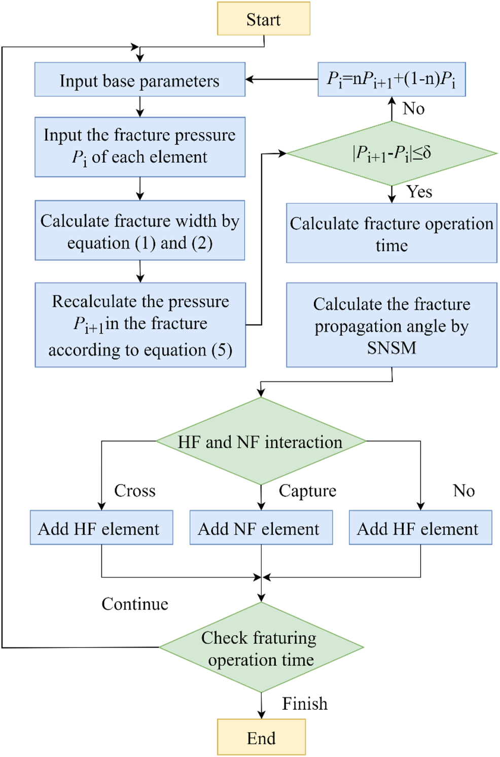 The flow chart of the numerical algorithm is shown in Figure 5. First, rock, fluid, and other parameters are input, the initial fracture grid is constructed, and the initial fracture pressure Pi is assigned to each grid. The normal and shear displacements of each fracture element are calculated by Eqs 1, 2. and are determined by the remote and local stress boundary conditions, and the fracture width Dn of each DDM element is calculated by coordinate conversion. The flow rate and viscosity in each element are known; thus, the new pressure Pi+1 in the fracture is obtained according to Eq. 5. When the calculation error of Pi and Pi+1 is less than the convergence accuracy δ (δ = 0.001 MPa), the fracture propagation angle is calculated by the stress numerical search method (SNSM) (Cong et al., 2021), and a displacement discontinuous element is added in this direction (n is the convergence coefficient; in this article, n = 0.2). If the added unit meets the NF in the calculation domain, the interactive propagation is judged by the propagation criterion in Section 2.4. Otherwise, the HF will continue to propagate along the maximum circumferential stress direction until the fracturing operation is completed.