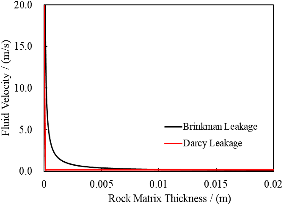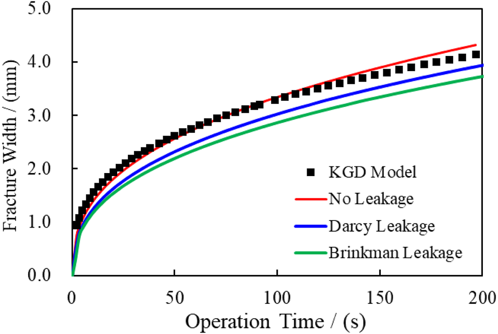 Since the KGD model does not consider the influence of leakage on fracture propagation, the leakage term in Eq. 6 is ignored. Firstly, the model in this paper is used to calculate and compare the fracture width propagation without leakage, as shown in Figure 6. The calculation results show that when there is no leakage effect, the fracture width propagation curve of the KGD model and this model has high consistency. When the fracture propagates to 200 s, the fracture width calculated by the KGD model and this model is 4.13 and 4.32 mm, respectively, with a difference of only 4.3%. Considering the influence of fluid leakage, the crack width propagation is calculated by the Darcy equation and Brinkman equation, respectively. As part of the fracturing fluid leakage into the rock matrix, the fracture width values are lower than those in the non-leakage state, and the fracture width values obtained by the Brinkman equation are lower than the calculation results of the Darcy equation. The Darcy equation has a discontinuous velocity at the fracture boundary (as shown in Figure 7), while the Brinkman equation considers the continuous velocity of the fracturing fluid when it crosses the fracture boundary. The fracturing fluid flow rate shows a gentle downward trend, the calculated fracturing fluid filtration volume is more, and the fracturing fluid volume used for fracture propagation is reduced. Therefore, the results shown in Figure 6 appear.