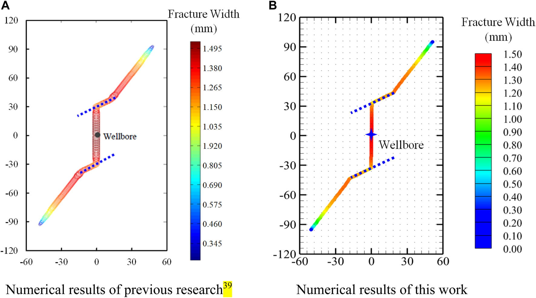 Wu and Olson (2014) systematically studied the propagation behavior of the HF after approaching the NF and well analyzed the interactive propagation behavior under different approaching angles, stress differences, crack lengths, and other factors. Two NFs (blue dotted line in Figure 8) are set on the HF propagation path. The propagation form of the HF is simulated by the model in this article and compared with the calculation results in the work of Wu and Olson (2014). The parameters are shown in Table 2, and the simulation results are shown in Figure 8B.