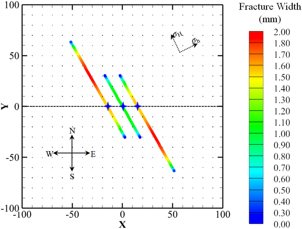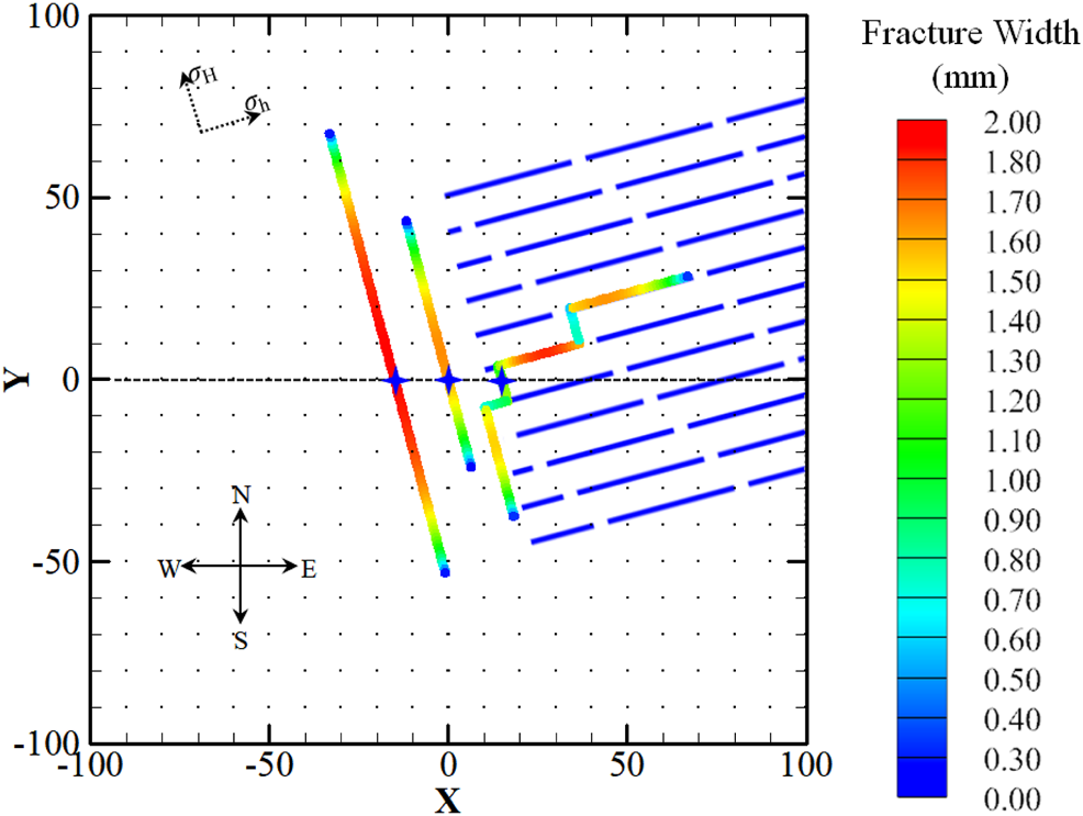 In terms of numerical simulation of fracture propagation in reservoirs with NF, Liu et al. (2019) established a multi-fracture propagation model with shale bedding. The simulation found that the growth of hydraulic fractures in the middle area was inhibited and could not continue to propagate through the bedding like the fractures on the outside. Bakhshi et al. (2019) studied the propagation behavior of HF when hydraulic fractures are orthogonal to NF in three-dimensional space. The research shows that increasing the approximation angle and cohesion is more conducive to promoting the crossing propagation of HF. Tang et al. (2018) well analyzed the inhibitory effect of NF on the propagation of HF height, and the research pointed out that the fracture height is easier to pass through the horizontal NF arranged symmetrically. Fu et al. (2018) considered the anisotropy of NF and pointed out the influence of NF height and intensity on HF. Zhang et al. (2019) studied the propagation behavior of HF in fractured storage by using a full three-dimensional model.