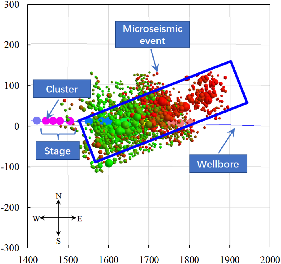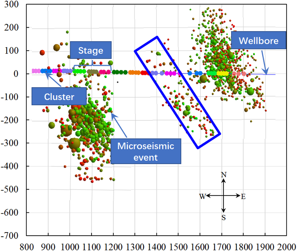 The NF zone along the direction of minimum horizontal principal stress is set to pass through the horizontal wellbore. The length of each fracture in the NF zone is 36 m, the spacing of fractures in the X-direction is 4 m, and the spacing of fractures in the Y-direction is 5 m. The simulation results are shown in Figure 12. Since the HF cannot meet the mechanical conditions of penetrating the NF, when it approaches the NF, the HF is captured by the NF and propagates along with it. After reaching the end of the NF, the HF enters the rock matrix and propagates until it is captured by the next NF. It can also be seen in Figure 12 that although the NF existence changes the complexity of HF, the length of the fracture in the middle is still significantly shorter than that on both sides under the action of “stress shadow.” Compared with the microseismic monitoring results of G1701H well, it is found that the simulation results are highly consistent with those of stage 4. The number of microseismic events in this stage is 2,566, and the microseismic events basically occur near the left and right clusters of fractures and then extend to the north–east, indicating that the NF in the fracturing area of stage 4 is relatively developed (Figure 13). During the propagation process, a large number of NFs along the minimum horizontal principal stress are activated, forming a more complex fracture network.