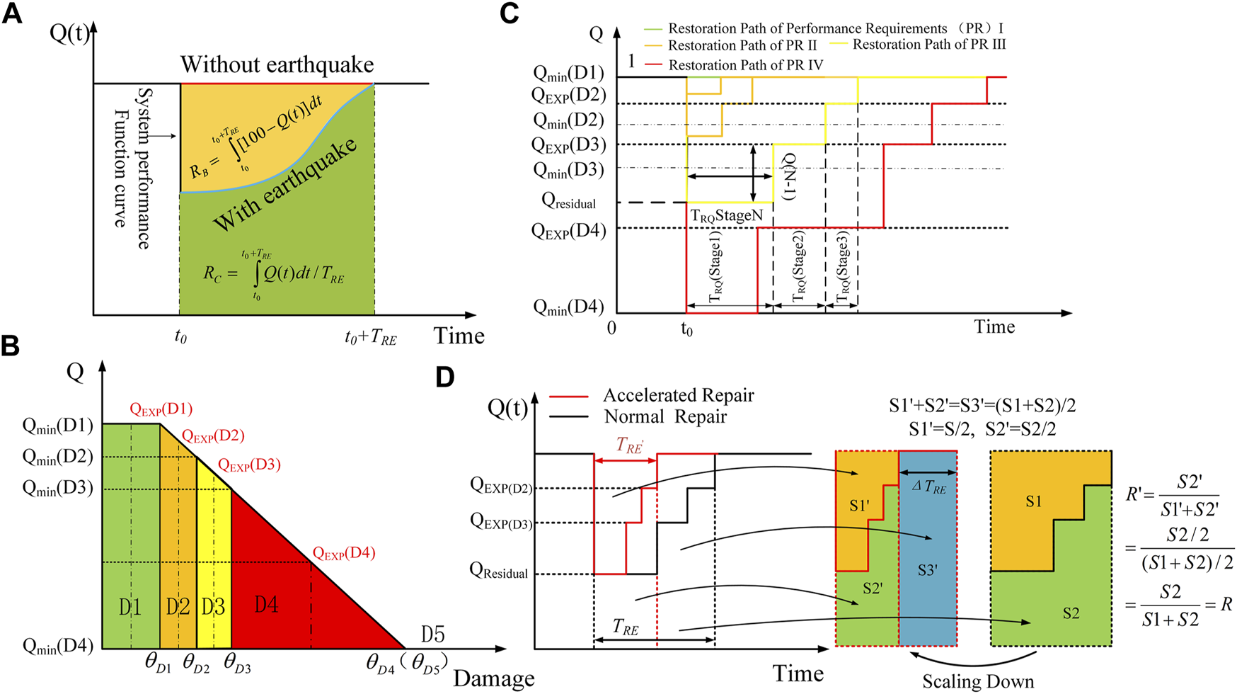 (A) A typical seismic resilience model; (B) definition of the repair target for each stage; (C) recovery profile for different performance requirements and (D) shortcomings of existing quantification method of the functional recovery index.