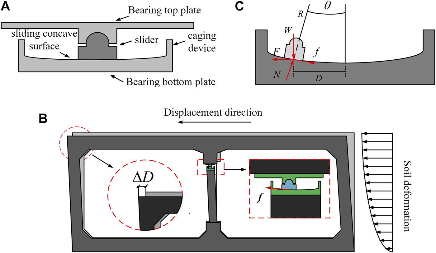 (A)Structural map of friction pendulum bearing; (B) working mechanism of friction pendulum bearing and (C) force analysis diagram of friction pendulum bearing in the case of an earthquake.