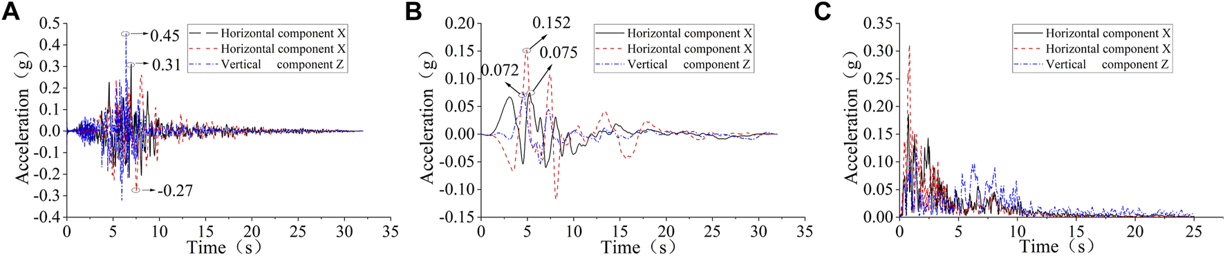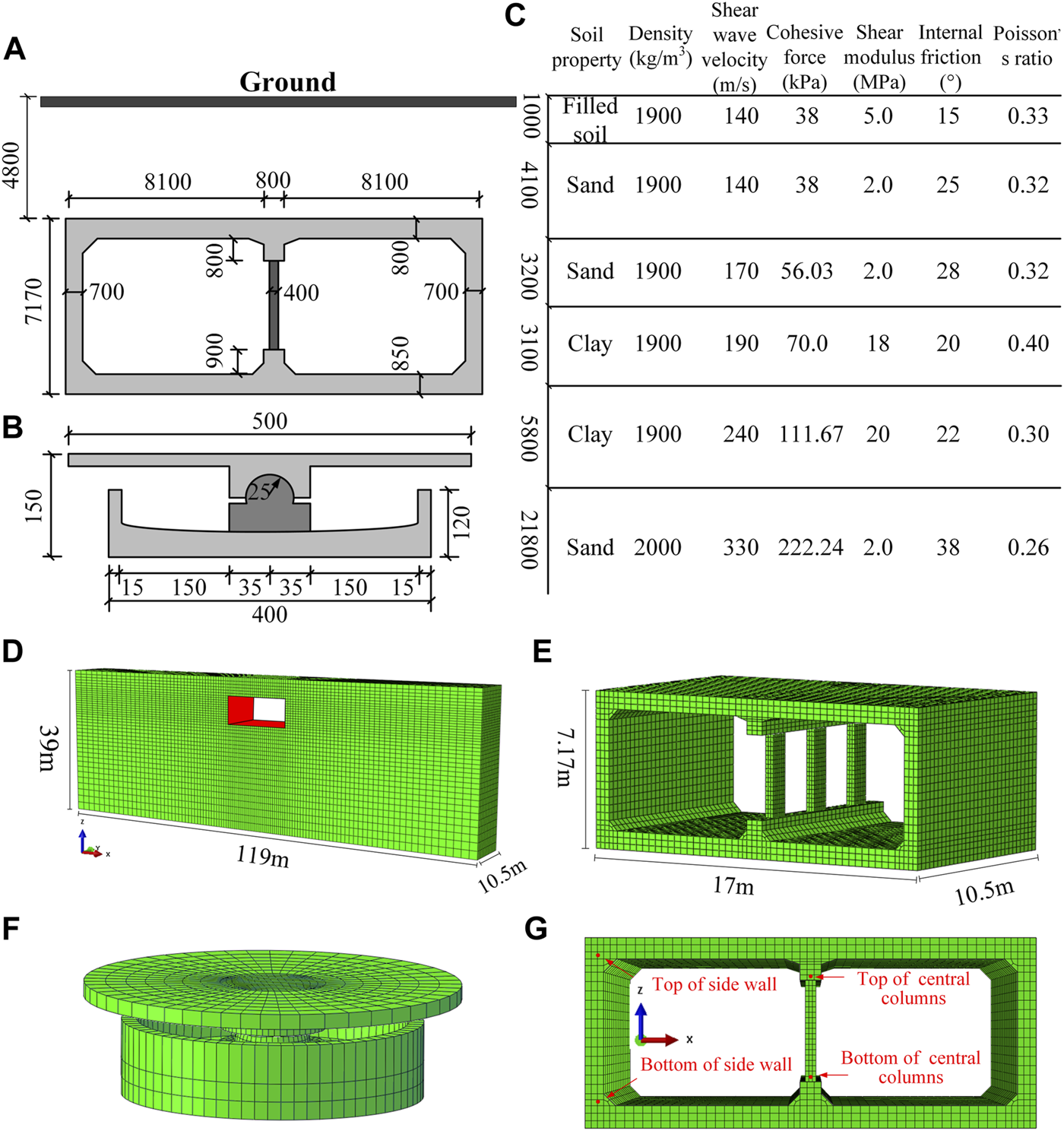 To demonstrate the proposed seismic resilience assessment framework for subway stations and analyze the effectiveness of the seismic resilience improvement method, a three-dimensional numerical simulation was performed with the Daikai station as a prototype. The Daikai subway station is a single-layer, double-span, rectangular frame structure, and its crosssection is shown in Figure 4A. The thickness of the covering Earth of the station is 4.8 m, and the concrete grades C30 and C35 are used for the main structure and central columns of the station, respectively. In addition, the reinforcement ratios of the sidewall, top and bottom plates, and central column are 0.8, 1.0, and 0.6%, respectively. All the reinforcements adopt screwed reinforcements with a diameter of 32 mm. Figure 4B shows the detailed size of the FPB. The main physical and mechanical parameters of the soil in each layer of the site are listed in Figure 4C.
