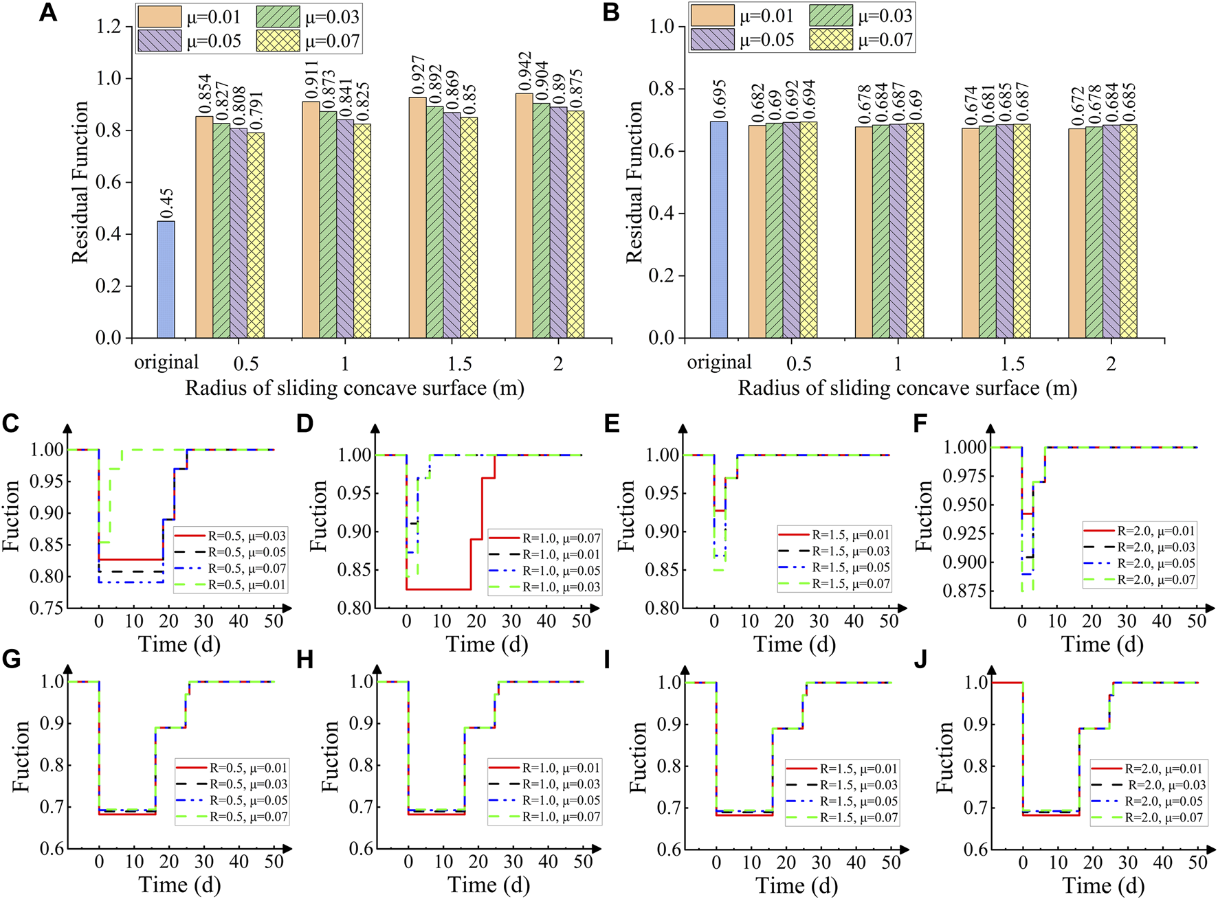 In Figure 3C, θ is the rotation angle of the slider relative to the vertical symmetry axis of the bearing bottom plate; D represents the horizontal displacement of the slider; W denotes the vertical bearing weight of the FPB, and its component in the normal direction of the sliding concave surface is Wcos(θ); R indicates the radius of the sliding concave surface radius; f is the sliding friction force of the slider; F stands for the horizontal shearing force transmitted by the structure.Where, μ is the sliding friction coefficient of the slider, and when θ is very small, cosθ is approximately equal to 1. Assuming the value of F remains unchanged, it can be seen from Eq. 16 that when W and μ remain unchanged, the increase of sliding concave surface radius will lead to a longer slide distance for the slider to reach balance. Similarly, when μ increases and R remains constant, the slide distance to reach equilibrium decreases accordingly. In conclusion, the deformation of the central column closely correlates with the friction coefficient and the radius of the sliding concave surface.