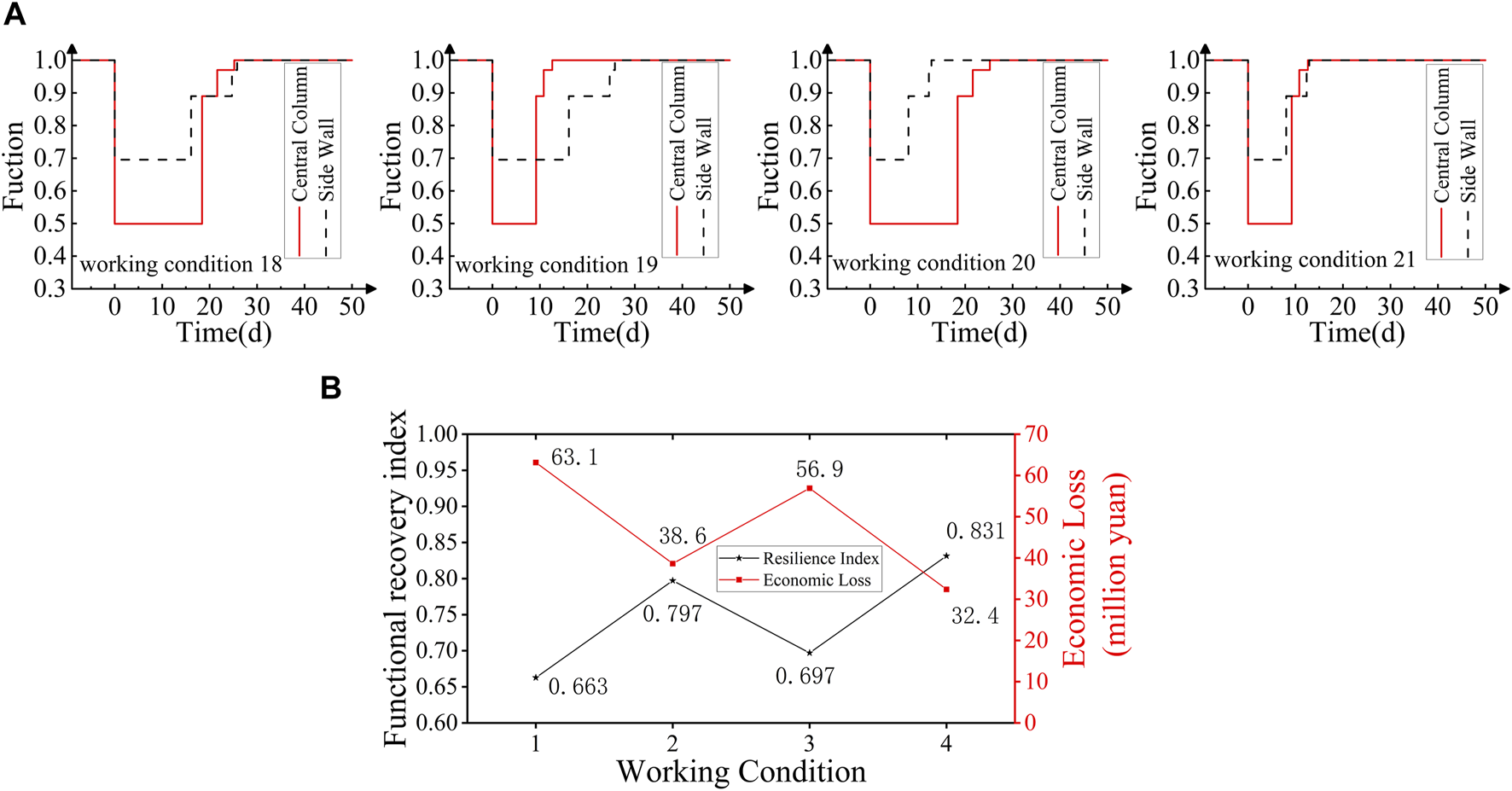 The second method is a quantitative method based on “resilience index”, where the seismic resilience of a research object is represented by indices, such as the repair time or economic loss. Chang and Shinozuka (2004) provided an initial idea for this approach by taking the probability that the structural residual function and repair time both meet structural performance goals, such as the resilience index of a community. Other research works have also used this thought (Liu et al., 2017; Xue et al., 2021). Moreover, the current industry standards for seismic resilience evaluation, such as FEMA-P58 (FEMA, 2012), REDi (Almufti and Wilford, 2013), and Standard for the seismic resilience assessment of buildings (GB/T 38591-2020, 2020), all adopt this quantitative method. Although this method is easy to understand and operate, it cannot describe the performance changes of a research object during a repair process, which is very important for some structures.