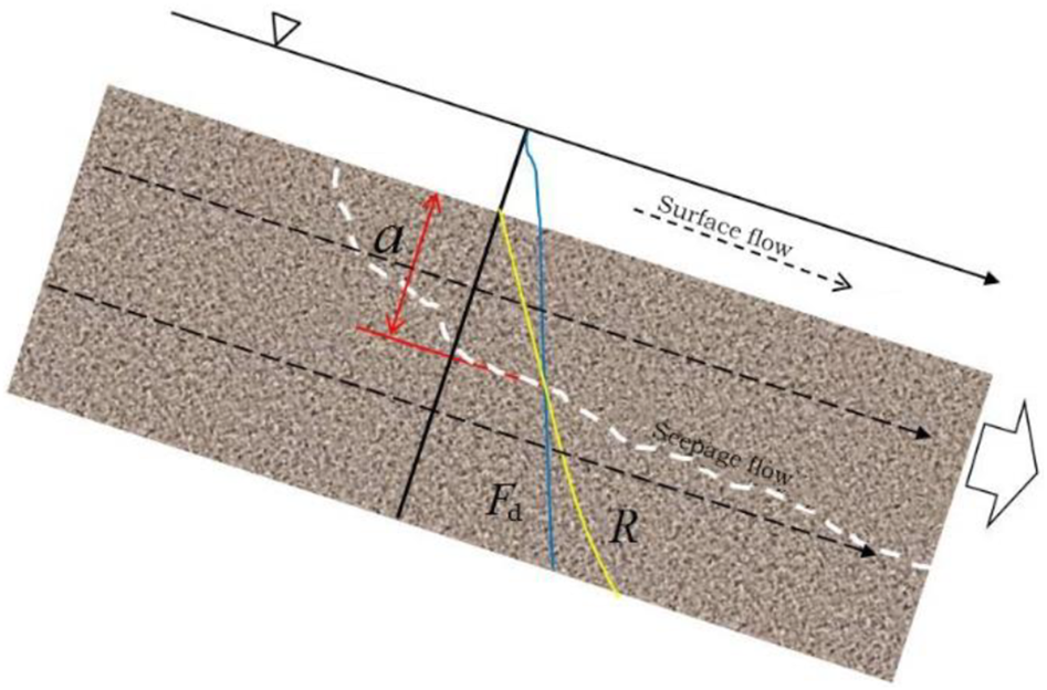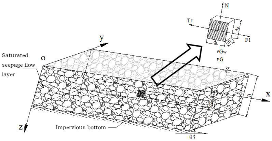 During the seepage process, the particle framework prevents water flow in the pores between the particles. We assume dense debris so that the shear resistance between the particles iswhere is the soil particle density, n is porosity, is the slope angle, is the volume of the volume element, and is the thickness of the volume element.