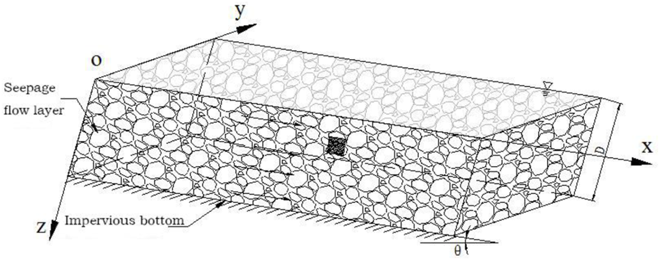 Water is the essential ingredient in debris flows and mainly comes from rainfall, surface water flow, and groundwater flow. The water movement occurs in saturated seepage flow, unsaturated flow, and surface flow. Figure 2 shows the model of saturated seepage flow of loose solid materials. We assume that the particles are heterogeneous and anisotropic. The porosity of the detrital grain layer is n, the thickness is D, the slope angle is θ, and the thickness of the surface water layer is H (H = 0 means an absence of surface water). Finally, the bottom plate is impermeable, and the saturated seepage flow is distributed over the whole layer.