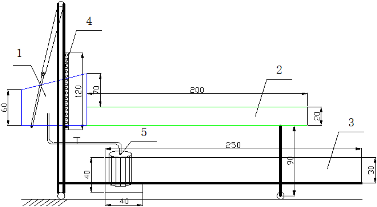 Schematic of the experimental setup (units in cm) one water tank, two experiment flume, three circular water pond, four frame, five water pump.