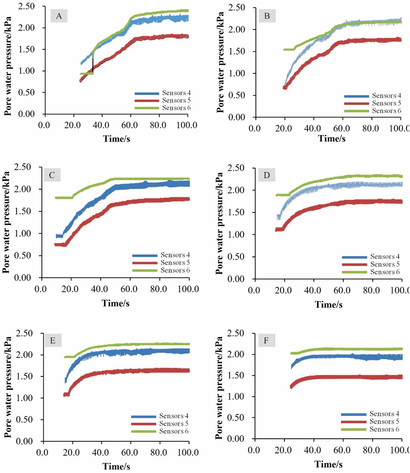 Pore-water pressure changes through the experimental process for various slope angles (A) 6°, (B) 9°, (C) 12°, (D) 15°, (E) 18°, and (F) 20°.