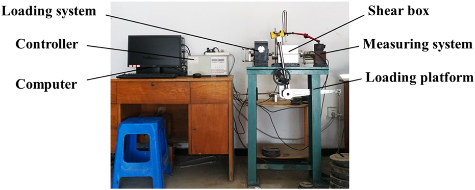 Conventional direct shear apparatus can only carry out test of the rock joint without filling. According to the experimental characteristics of rock joint with weak interlayer, a direct shear apparatus is developed in this paper. The apparatus was mainly composed of loading platform, loading system, measuring system, controller, shear box and supporting computer software (Figure 1). The sensor measured normal and tangential load were applied by mechanical lever and stepping motor. Normal and tangential displacement were obtained by measurement sensor. Specific technical indicators of the apparatus are shown in Table 1.