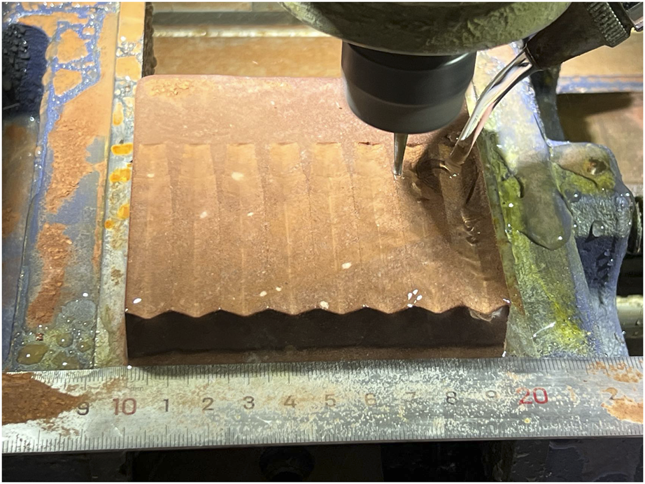 Morphology of rock joint is one of the main factors affecting shear strength of weak interlayer (Du et al., 2022). In order to study the influence of moisture content and filling degree on shear strength, the regular saw-tooth rock joint is adopted with specific tooth height of 3 mm and width of 12 mm. Red sandstones were carved by MD-6060 numerical engraving machine. The specific steps were as follows. Firstly, the corresponding saw-tooth morphology model was established in modeling software, and the generated path file was imported into control software of the numerical engraving machine. Secondly, red sandstone was put into the engraving machine and fixed by bolts. Thirdly, the engraving program was started by the control software, and cutter head was controlled to carve the red sandstone according to specified path. Finally, the morphology of the saw-tooth was carved completely (Figure 2).