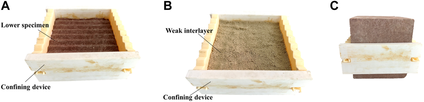 Process of sample preparation: (A) Installation of confining device; (B) Add weak interlayer; (C) Sample preparation.