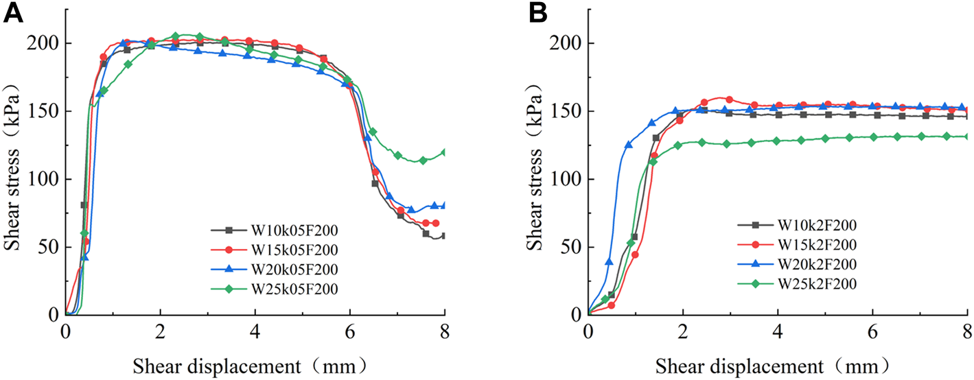 Shear stress–displacement curve under different filling degrees: (A) W = 15%; (B) W = 25%.
