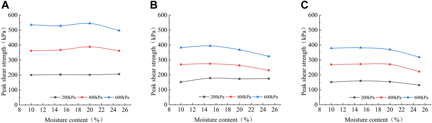 Peak shear strength under different moisture contents: (A) k = 0.5; (B) k = 1.0; (C) k = 2.0.
