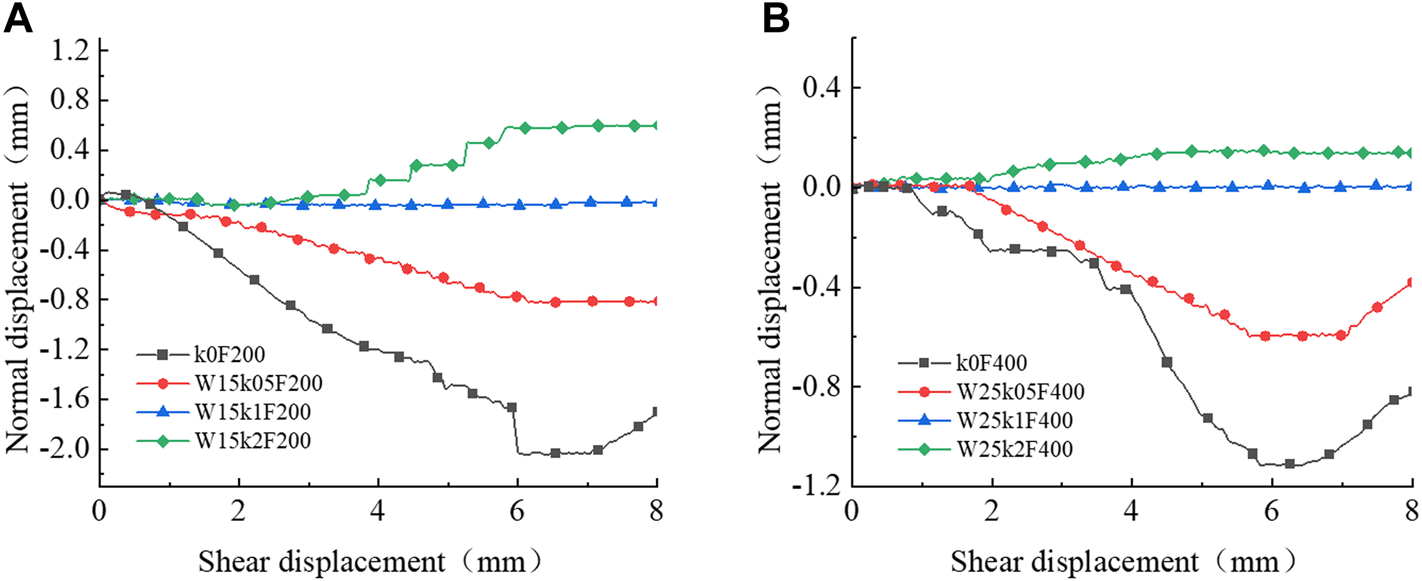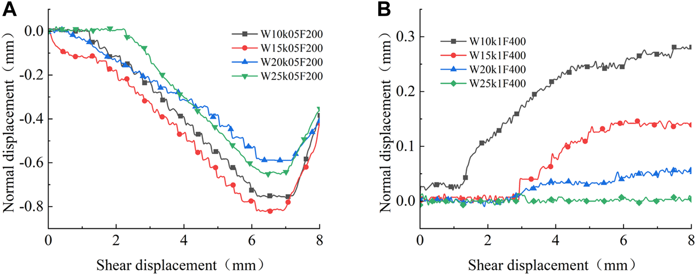 Normal–shear displacement curve under different filling degrees: (A) W = 15%, F = 200kPa; (B) W = 25%, F = 400kPa.