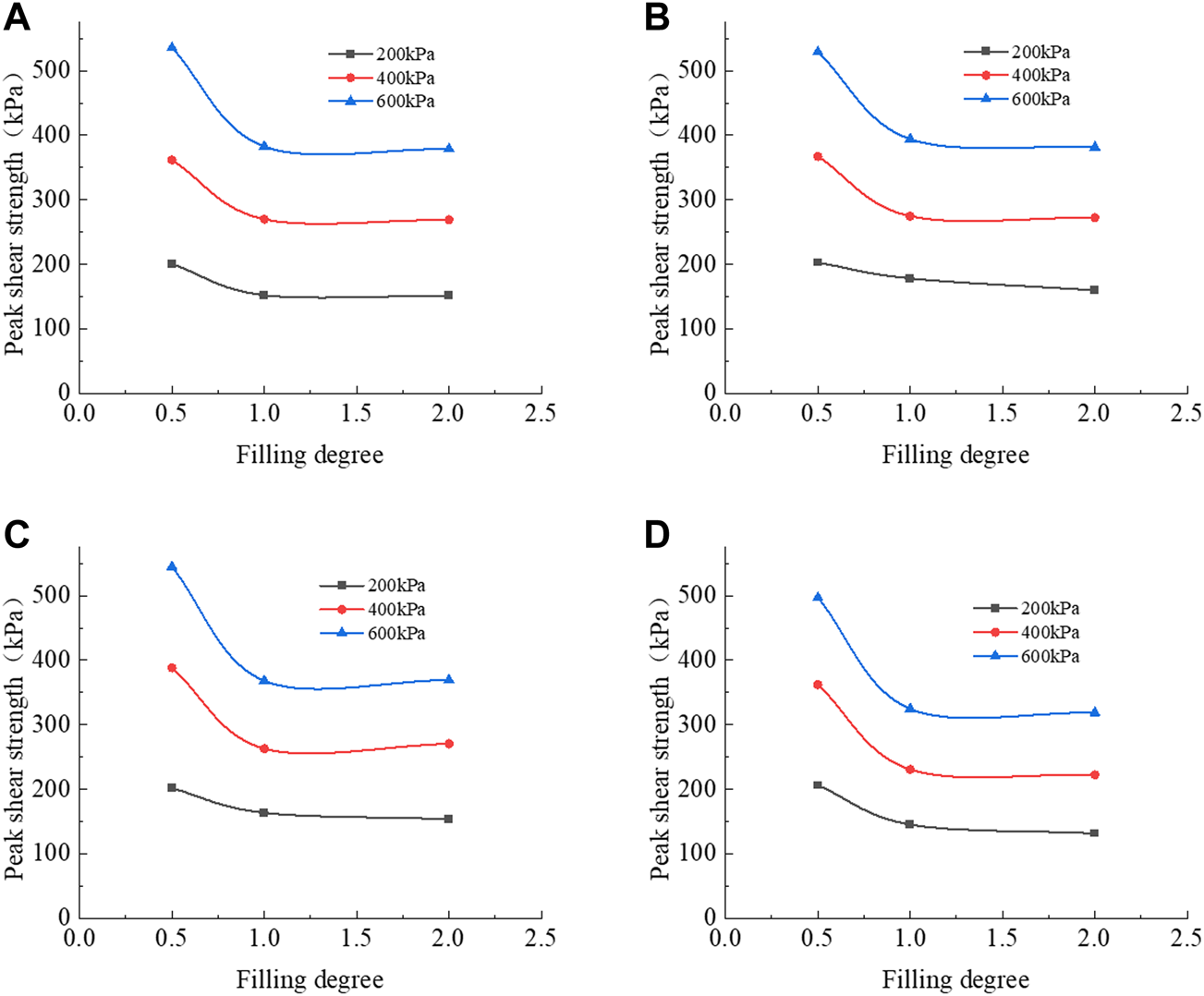 Peak Shear Strength under different filling degrees: (A) W = 10%; (B) W = 15%; (C) W = 20%; (D) W = 25%.