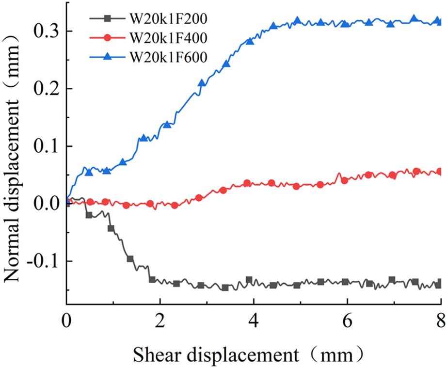 The normal–shear displacement curve under different normal stresses.