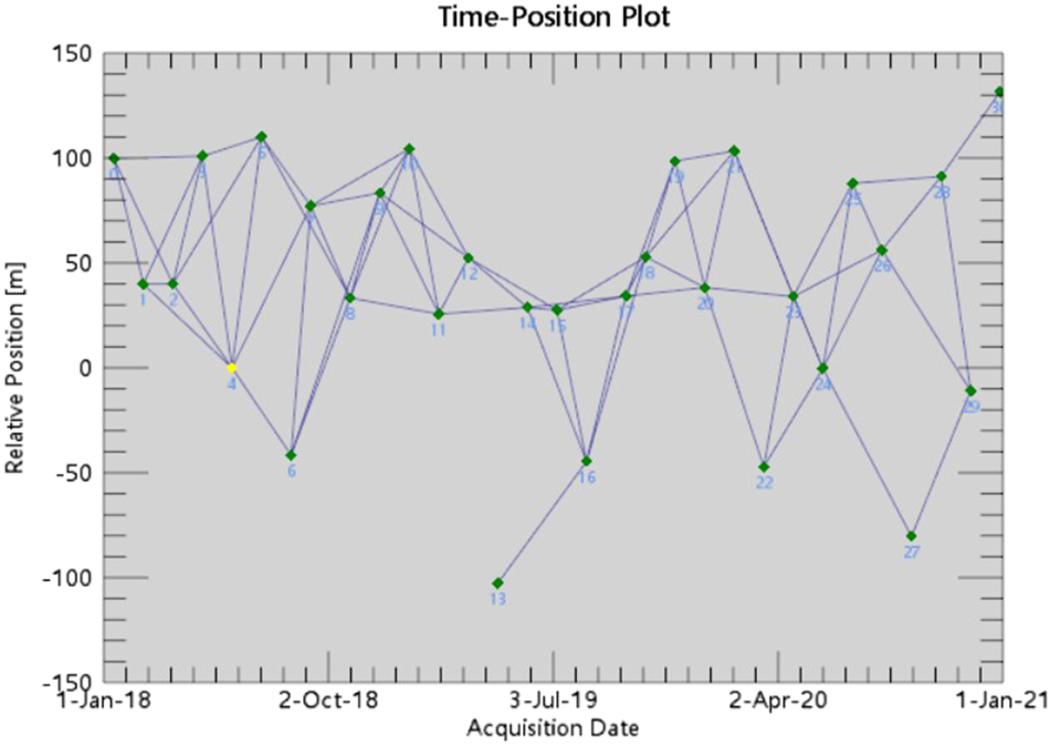 Sentinel-1A data processing was carried out using SBAS-InSAR method and the SARscape software. First, the region of interest was cut from the original datasets. Interferometric pairs with both short perpendicular and temporal baselines were selected to construct network of the SBAS interferometric pairs. We chose critical spatial baseline percentage smaller than 2% and temporal baselines smaller than 120Â days as the thresholds of the interferograms, and got 71 interferometric pairs (Figure 2). A master image was used as the geometry reference for SLC coregistration to minimize the effect of mis-coregistration caused by geometric, temporal, and Doppler decorrelations. The topographic phase in each interferogram was removed by the SRTM DEM. The interferograms were filtered by the Goldstein method. The minimum cost flow (MCF) algorithm and the unwrapping coherence more than 0.36 was chosen to unwrap the interferograms. 30 ground control points were selected in the region without interference fringes far from the deformation region, since orbital refinement and re-flattening were needed to remove the residual phase.