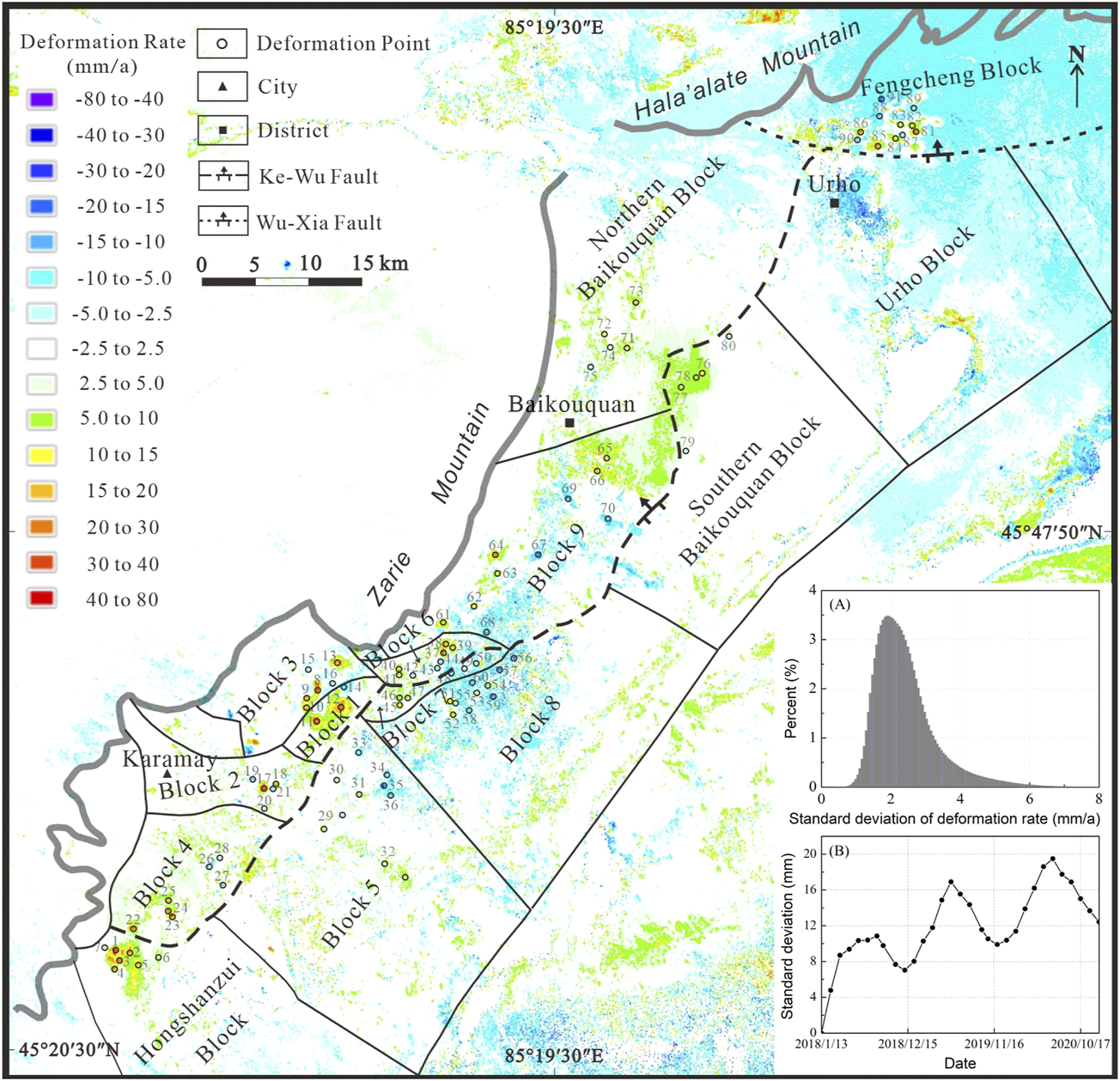 According to the remote sensing image of the study area provided by Tianditu and the deformation rate map (Figure 3), we selected 91 representative deformation points in different blocks for further analysis. These points are located in the centers of the main surface deformation areas where hydrocarbon exploitation occurs. As shown in Figure 4, the surface deformation distribution and rate vary in different blocks. A large area of surface uplift is developed in the Hongshanzui Block with the cumulative uplift in the range of 60∼140 mm, while the surface subsidence is weakly developed. Both uplift and subsidence are developed in Block 1 and Block 3, where the uplift area and the cumulative uplift are obviously larger than the subsidence area and the cumulative subsidence. Surface uplift is more developed than subsidence in Block 2 and Block 4. The largest cumulative uplift reaches up to 118 mm and the subsidence ranges from −24 mm to −78 mm in Block 2. The cumulative uplift ranges from 69 mm to 105 mm and subsidence ranges from −33 mm to -46 mm in Block 4. The uplift area in Block 5 is larger than the subsidence area, but the cumulative uplift is small, generally less than 40 mm. The subsidence area is mainly developed in the northeast of Block 5, but the cumulative subsidence is generally larger than the cumulative uplift, up to −100 mm. Surface uplift and subsidence are developed simultaneously in Block 6, and the cumulative uplift is obviously greater than the cumulative subsidence. Both area and cumulative deformation of uplift and subsidence are similar in Block 7. A large area of surface subsidence is developed in Block 8, and the cumulative uplift is basically equal to the cumulative subsidence. Surface uplift and subsidence are developed simultaneously in Block 9. Obvious uplift is developed in some regions of Block 9, and the cumulative uplift is greater than the cumulative subsidence. Small-scale uplift is dominant in Baikouquan area. The cumulative uplift is larger than the cumulative subsidence in Northern Baikouquan Block, and the cumulative uplift is similar to the cumulative subsidence in Southern Baikouquan Block. In the Fengcheng Block, the surface uplift and subsidence develop in mosaic type, the cumulative uplift is greater than the cumulative subsidence, and the cumulative deformation changes with mining activities, with obvious waveform characteristics.